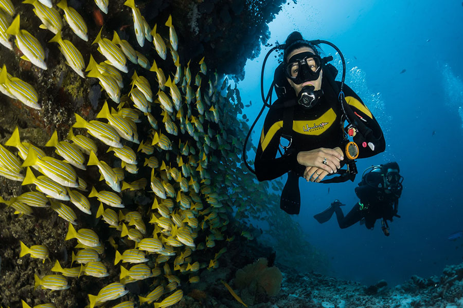 介绍:马累环礁是马尔代夫最好的水肺潜水目的地。无论您是潜水新手,还是希望挑战自我并更进一步:我们的潜水中心DiveOceanus提供广泛的课程,从发现水肺潜水到PADI潜水大师。离岛不远处是蝠鲼角(Manta Point),这是一个举世闻名的潜水地点,蝠鲼经常与海龟、巨大的拿破仑濑鱼和丰富的鱼类一起被发现。乘船不远即可到达著名的胜利沉船,以及香蕉礁和天堂岩等海洋保护区。体验温和的漂流潜水,令人振奋的海峡潜水,色彩缤纷的thila潜水(水下珊瑚平台)和附近的其他潜水。