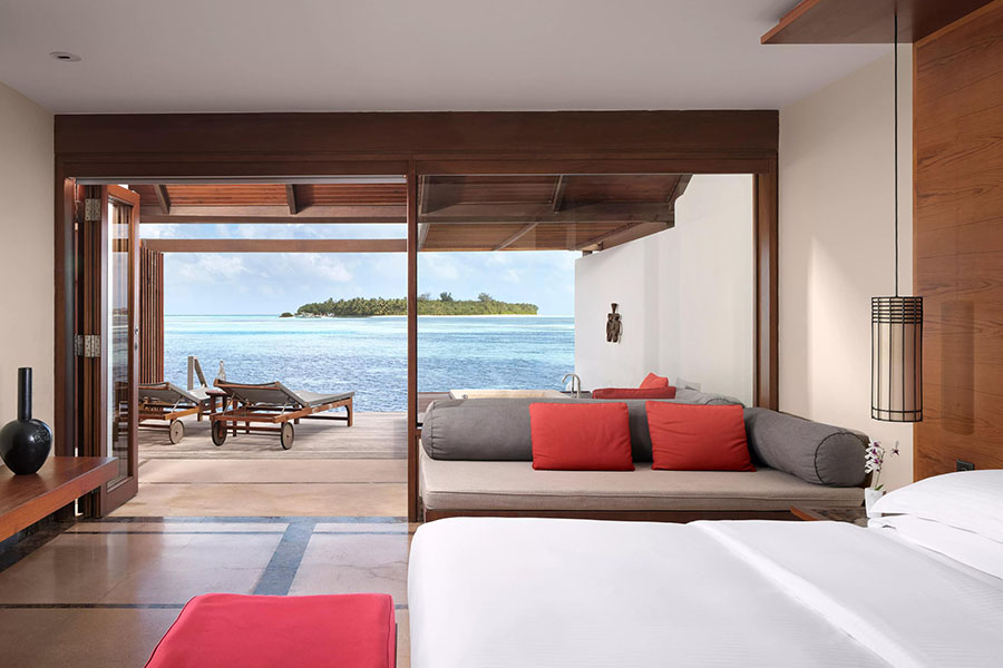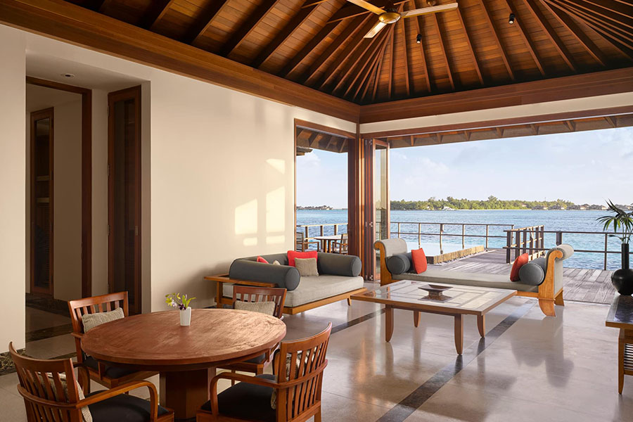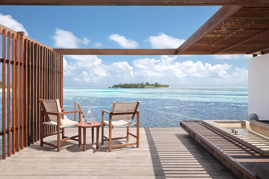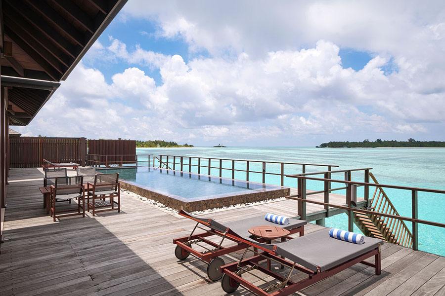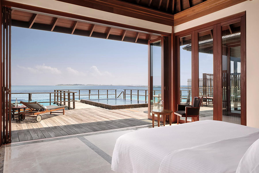 房型介绍:双卧室海洋套房设有两间宽敞的卧室、一个私人小型游泳池和一个面向日出的大型日光浴平台,是岛上最大的水上小屋。非常适合家庭入住,可直接通往下方水晶般清澈的泻湖,并享有地平线的全景。