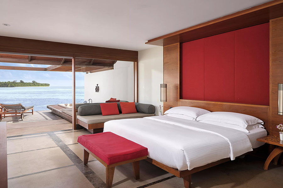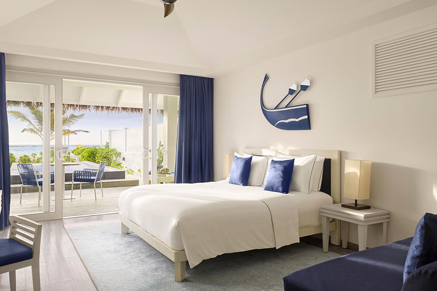 房型介绍:面向日出的卧室设有落地窗、私人游泳池和漩涡浴缸,蔚蓝的泻湖在您面前向各个方向延伸,营造出热带天堂。这些豪华宽敞且布置精美的水上平房是在马尔代夫度过浪漫蜜月的田园诗般的环境。而且,鉴于其宽敞的空间,这些别墅通常是家庭最喜欢的选择,他们喜欢添加两张宽敞的沙发床,与孩子一起度过一个美妙的假期。