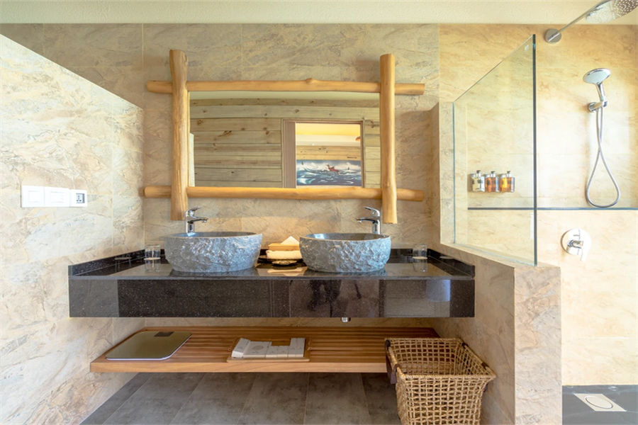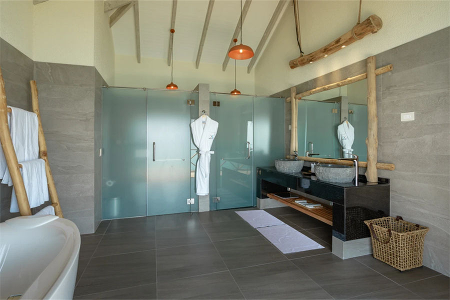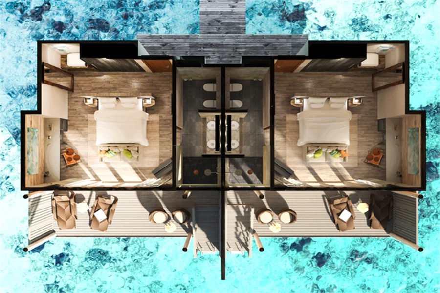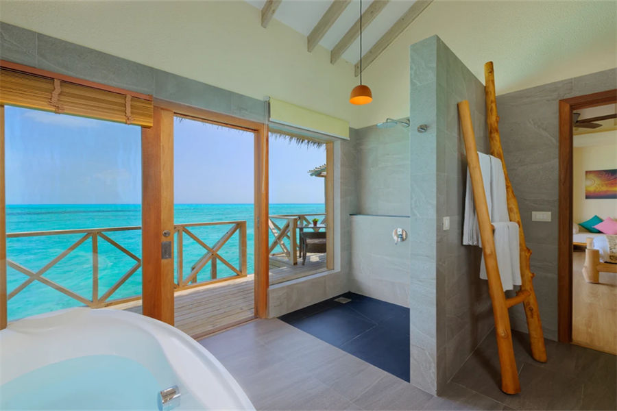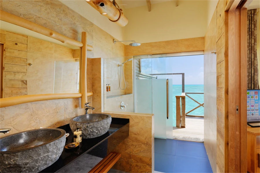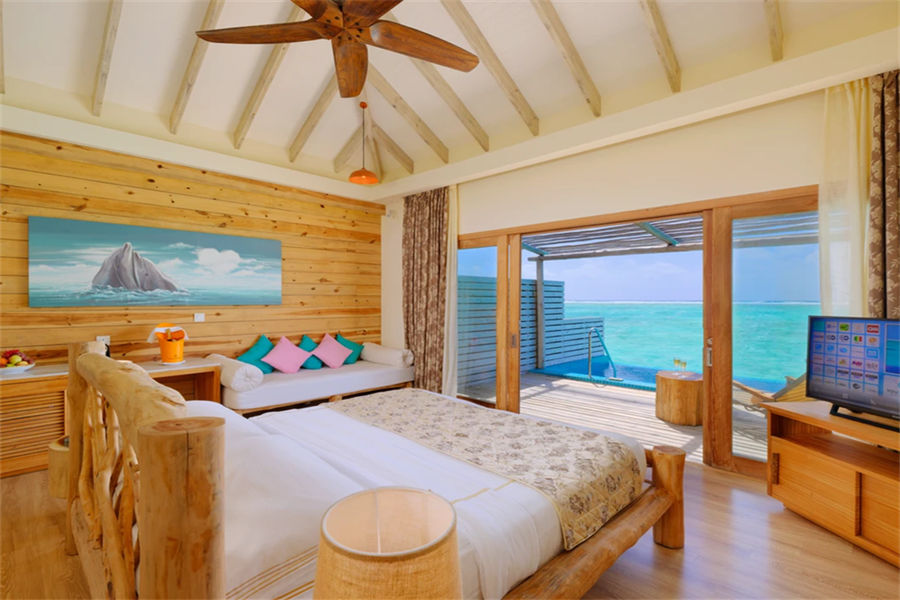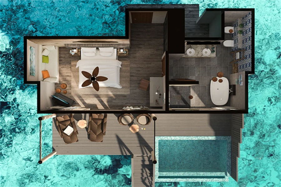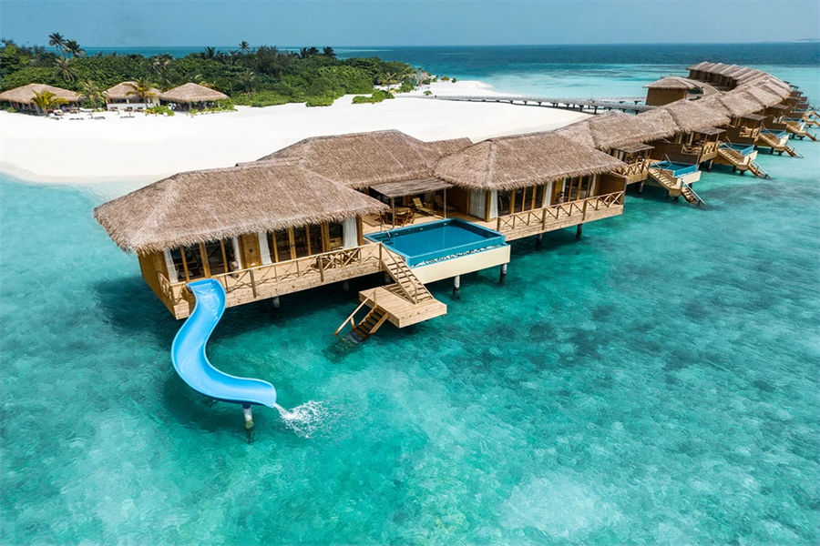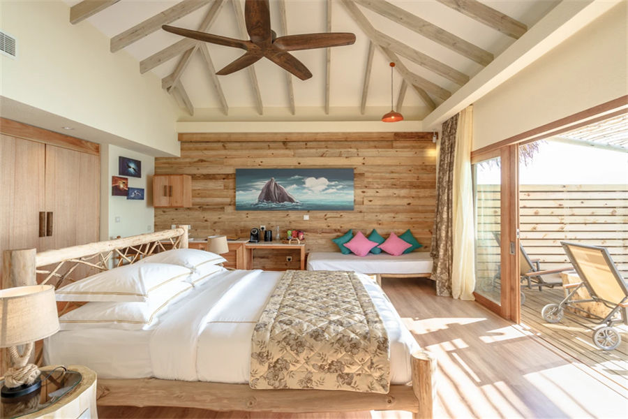 房型介绍:水上滑梯套房虽然没有泳池,但是却配置了水滑梯,乐趣只增不减。享有抛光的木地板、带花洒和情侣浴缸的浴室、俯瞰大海的特大号床、沙发、一个可放松身心的大型户外甲板,享受泻湖和令人惊叹的日出美景。