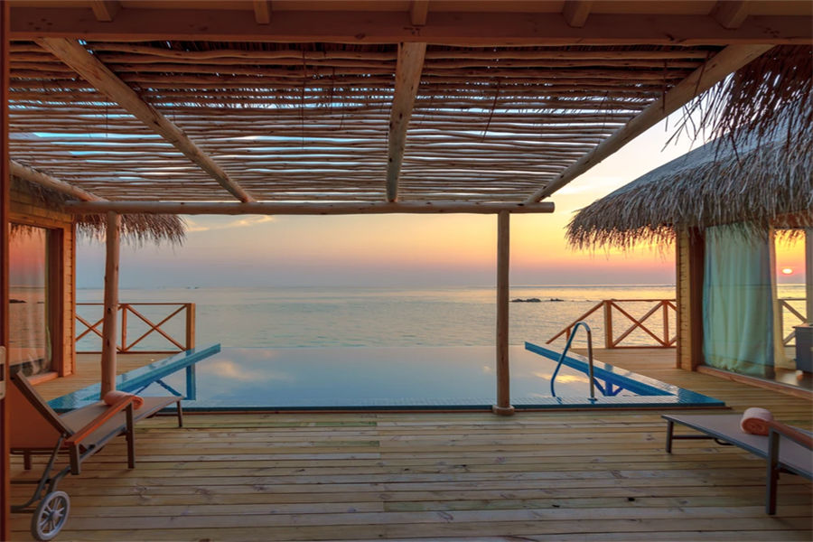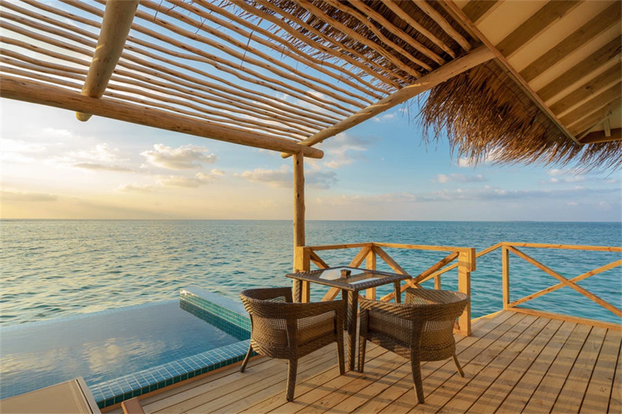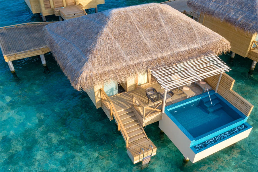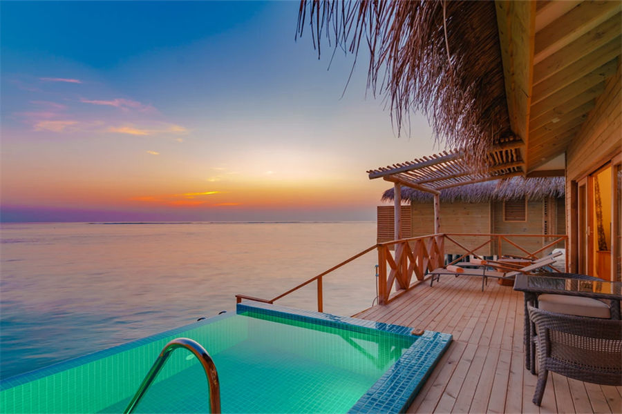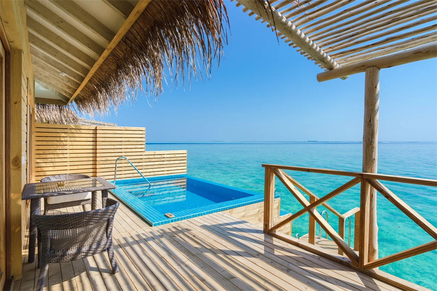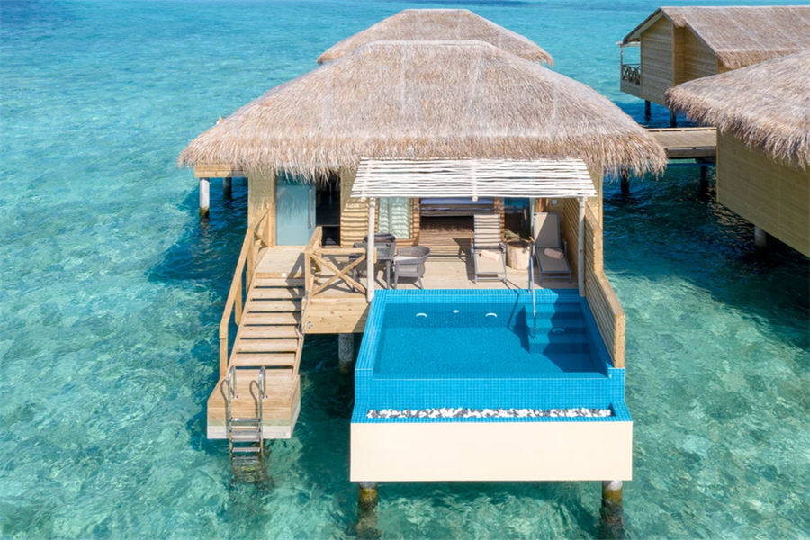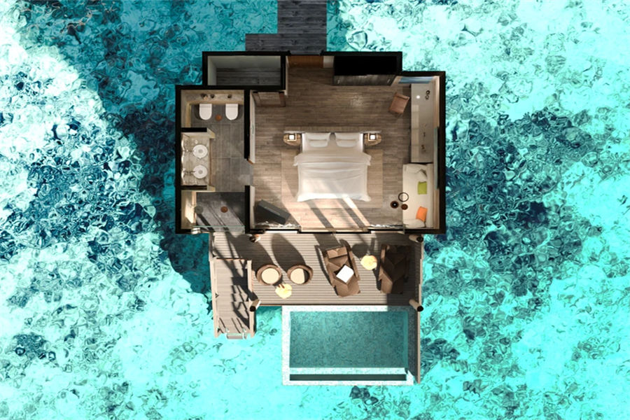 房型介绍:宽敞而具有私密性是泄湖水上泳池套房的一大特点,您在此可观赏壮丽的日落美景。房间设有抛光木质地板,可远眺大海的超大床,舒适的沙发,花洒淋浴以及可饱览泻湖无线景致的海滨露台。除此之外,如您置身于无边私人泳池之中,您则可将这壮阔的大海饱览于眼中!
