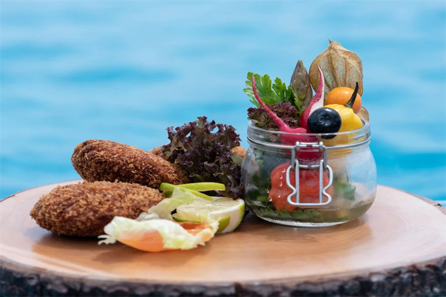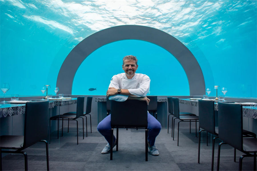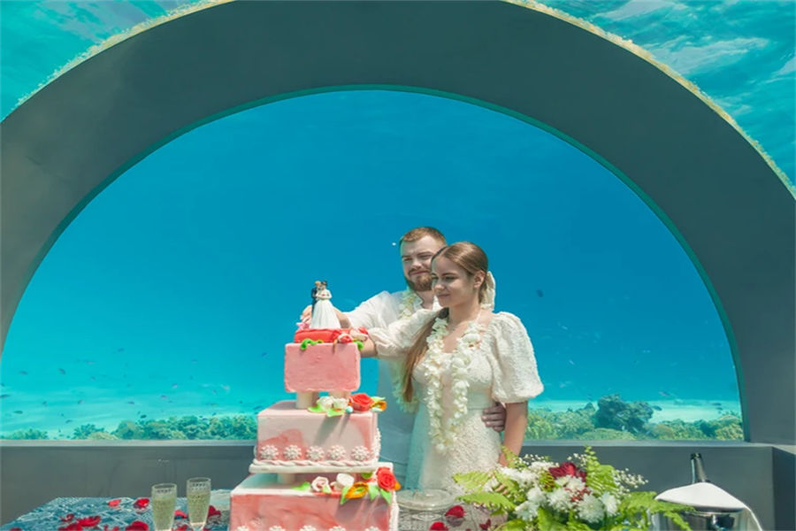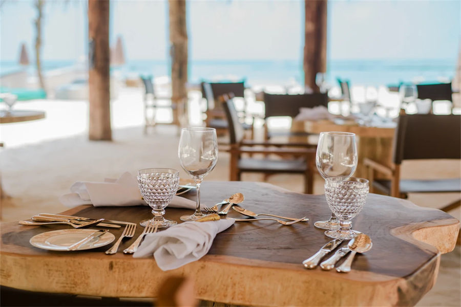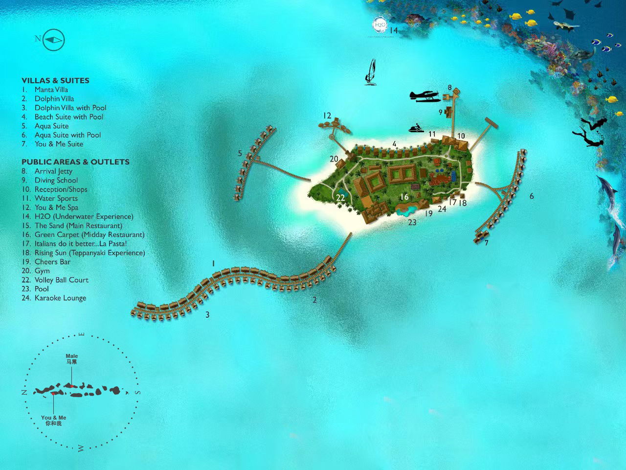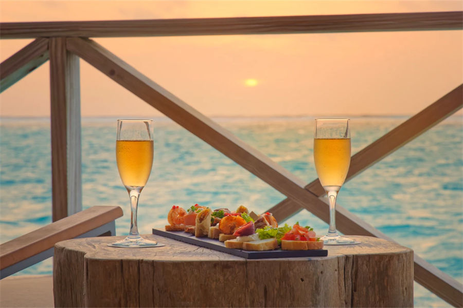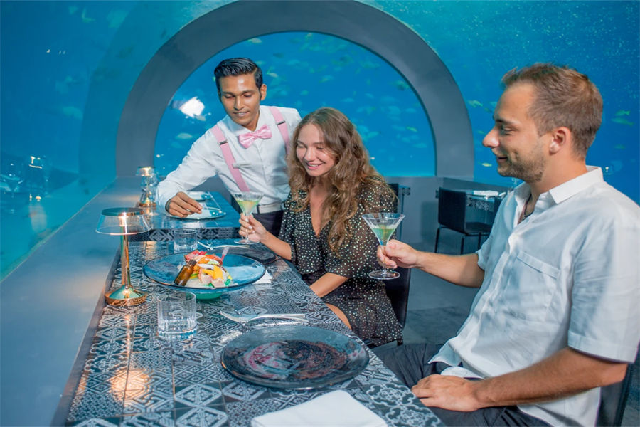 马尔代夫You & Me by Cocoon Maldives,位于马累以北“拉环礁”,从马累出发乘坐45分钟水飞即可抵达,隶属于可可尼度假村及别墅酒店旗下。度假村隶属于意大利业主,所以很多管理人员也是来自于意大利,包括餐饮团队,所以美食绝对是You&Me的一大特色。水下餐厅H2O,不同于其他度假村,H2O是独立于印度洋中央的水下餐厅,从岛上须搭船前往,某些时间段赠送双人水下餐厅午餐体验一次。度假村的餐饮计划都是带精选酒精及非酒精的饮料的,除软饮外,也有家酿红酒或啤酒多种选择。度假村带有不同风格的几种餐厅,包括主餐厅The Sand、意大利餐厅La Paste、日式铁板烧餐厅、绿地毯餐厅、水下餐厅H2O,若您是提前预订了半餐或全餐计划,除了水下餐厅H2O外,其他餐厅您均可前往,当然,由于日式铁板烧餐厅只有十个位子,所以一定要提前预订,所有餐厅均是点餐式或套餐式形式,提供中文菜单方便客人选择。蜜月度假村,不接受16周岁以下儿童或青少年的预订。当然,性价比绝对是度假村的一个重要卖点度假村追求的是轻松、自在的一个度假氛围,也希望寻找同样理念的客户群。