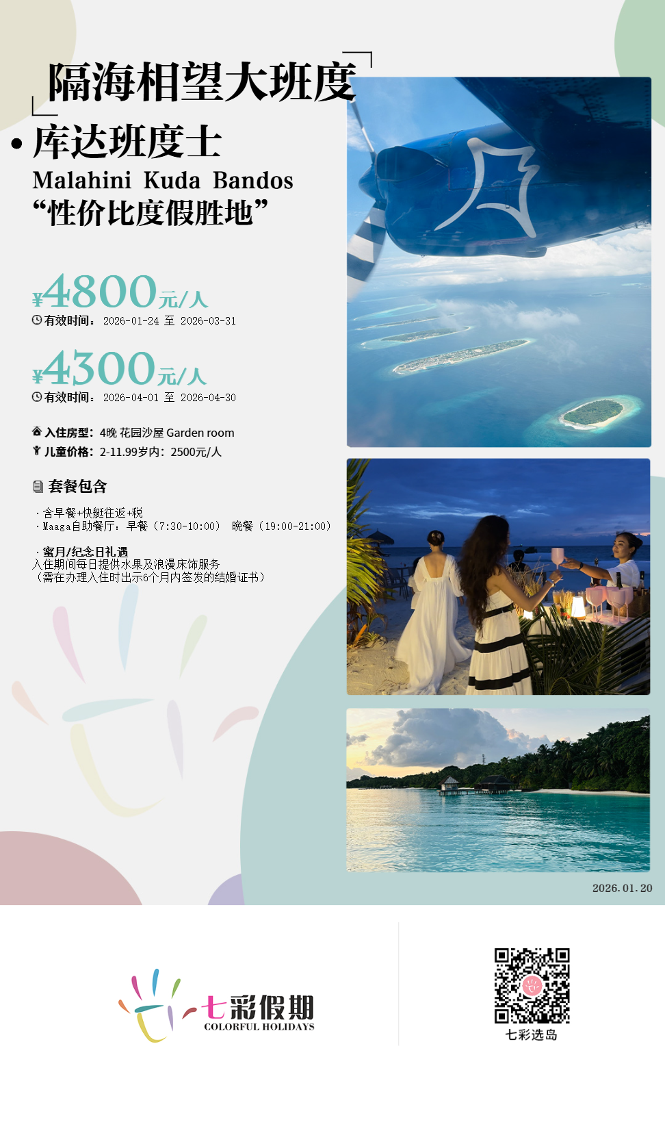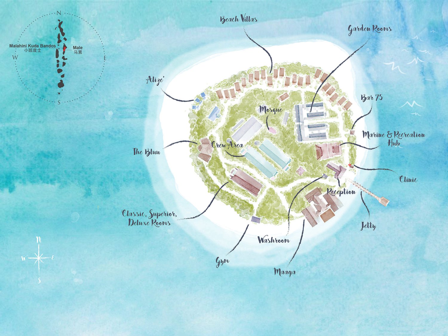 马拉希尼库达班度士Malahini Kuda Bandos,位于北马累环礁的中心地带,距离马累机场9KM,快艇15分钟可上岛,交通便捷,酒店优越的位置让游人前往市区内的热门景点变得方便快捷。度假村总共有82间客房,1个餐厅,2个酒吧,入住客人的最低年龄要求是2岁,2-11儿童需要加床,11岁以上的儿童入住此酒店将按照大人标准收费。岛上机动和非机动项目丰富,岛屿安静,适合经济预算比较低,或者是双岛游的游客选择。