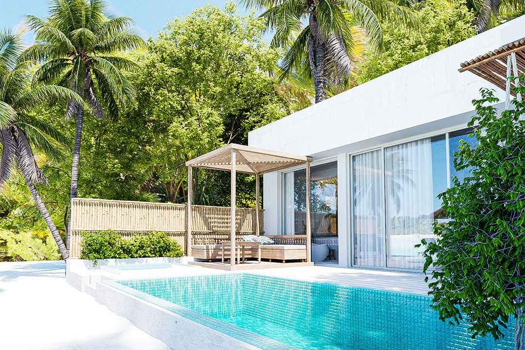 房型介绍:我们的日落海滩泳池套房面积 250 平方米,受到马尔代夫当地岛屿农庄的启发,融合了传统的马尔代夫家庭和奢华的现代内饰。我们的日落海滩泳池套房的元素经过精心挑选,完美地融合了文化和传统,采用舒缓的灰色和柔和的青瓷,与周围的植物相得益彰。