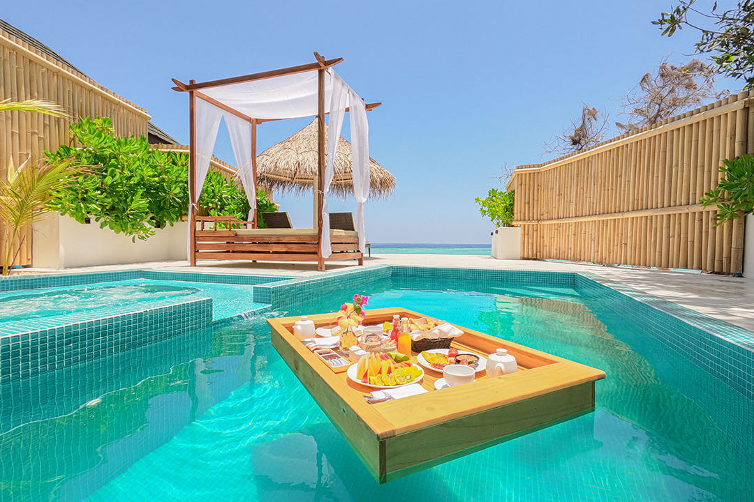 房型介绍:我们的日出海滩泳池别墅位于海岸线沿岸,占地 300 平方米,是相互连接的豪华现代别墅,融合了复古的马尔代夫内饰、私人泳池、按摩浴缸、所有独立客房和日光浴甲板,同时可欣赏到无可挑剔的耀眼日出景观