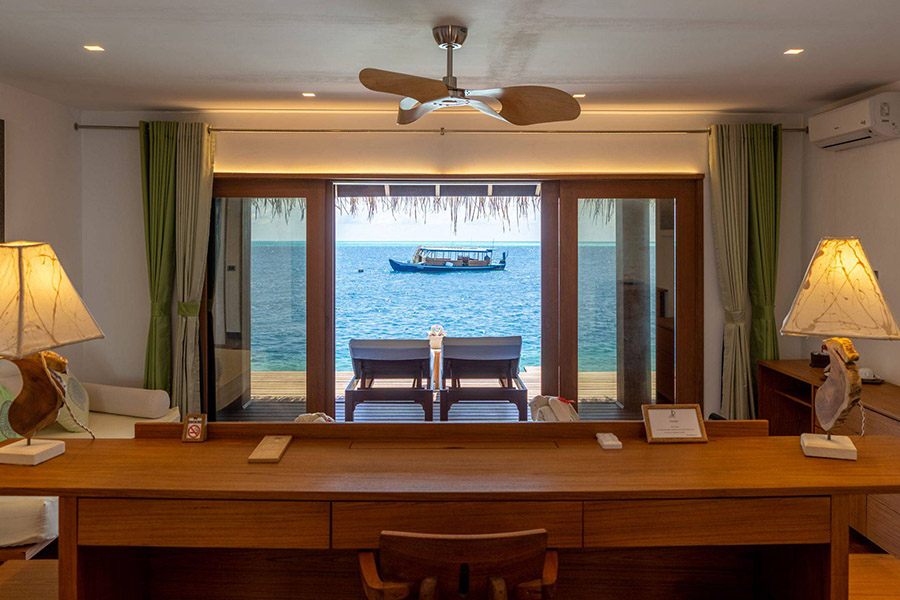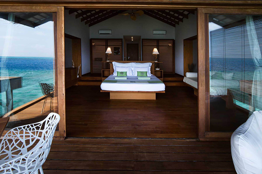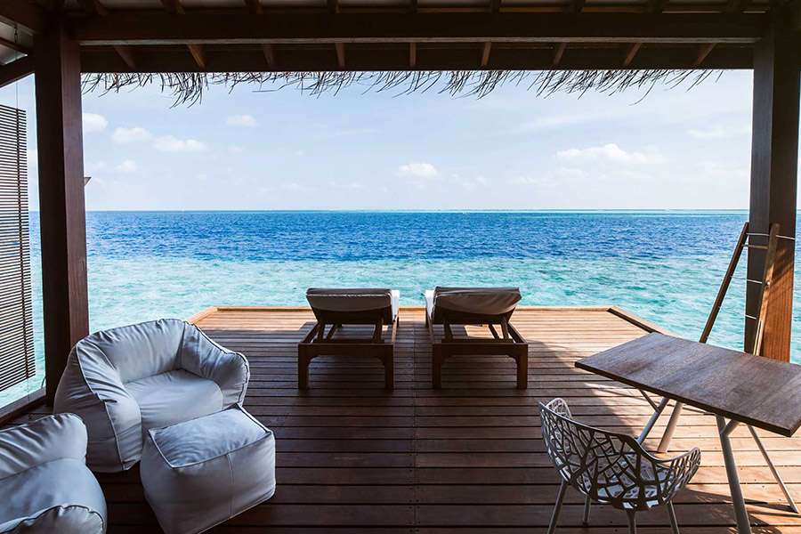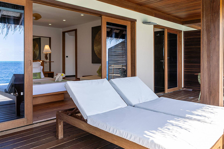 房型介绍:位于水上阁楼的一楼,水上套房面积约100平方米。套房配有手工制作的精美木制家具,拥有简约而精致的线条。可直接通往大海的大型室外露台和室内按摩浴缸提供私密而轻松的体验。
