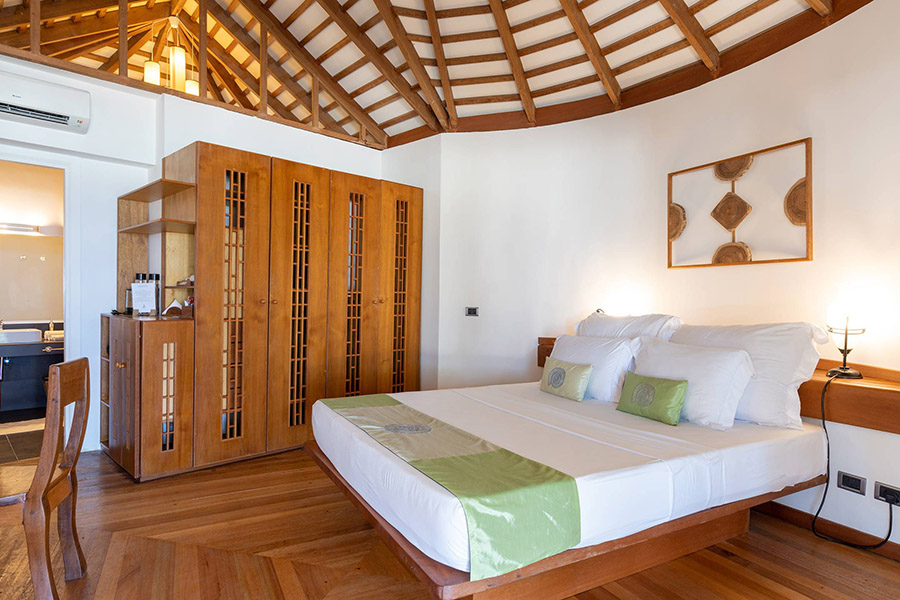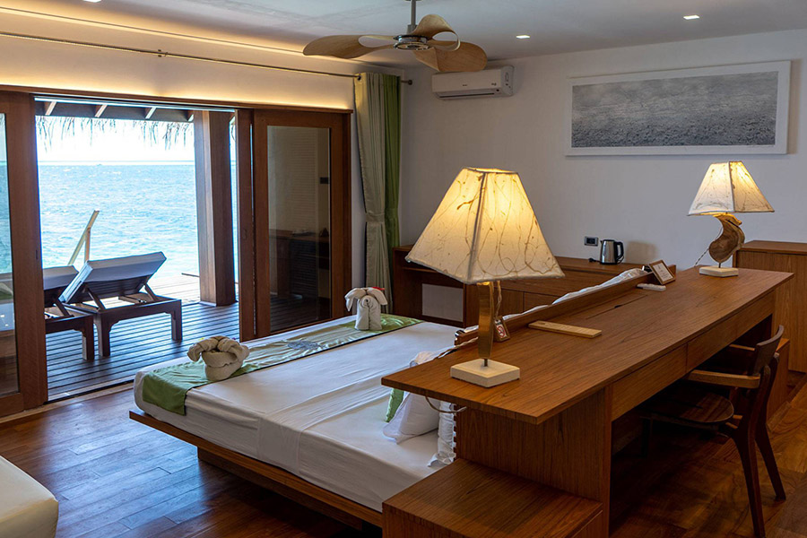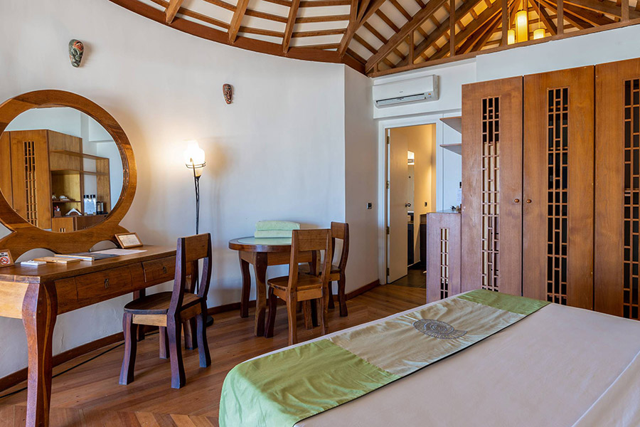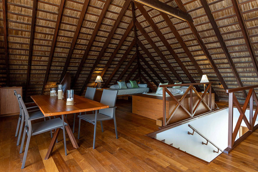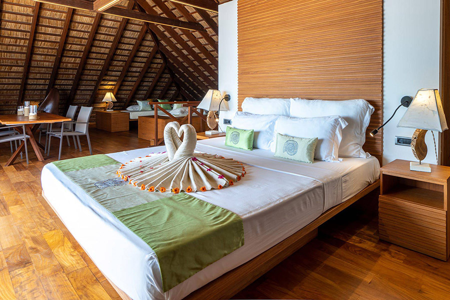 房型介绍:位于水上阁楼的二楼,高级套房面积约175平方米,套房内部配有珍贵的手工木制家具,设计简约精致。令人惊叹的私人露台可欣赏壮丽的海景,以及专属使用的按摩浴缸,提供浪漫而私密的体验。高级套房配备最好的设施,距离主要服务仅几步之遥,是度假村欣赏无尽星空的最佳地点。