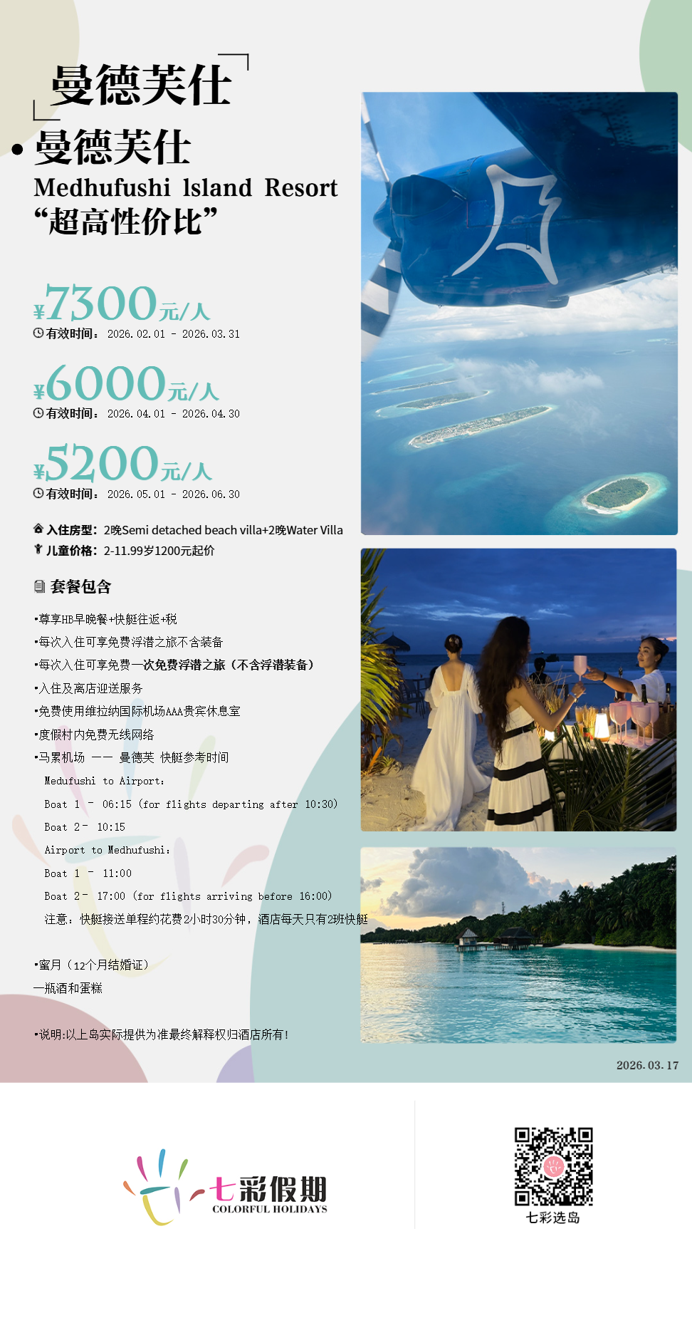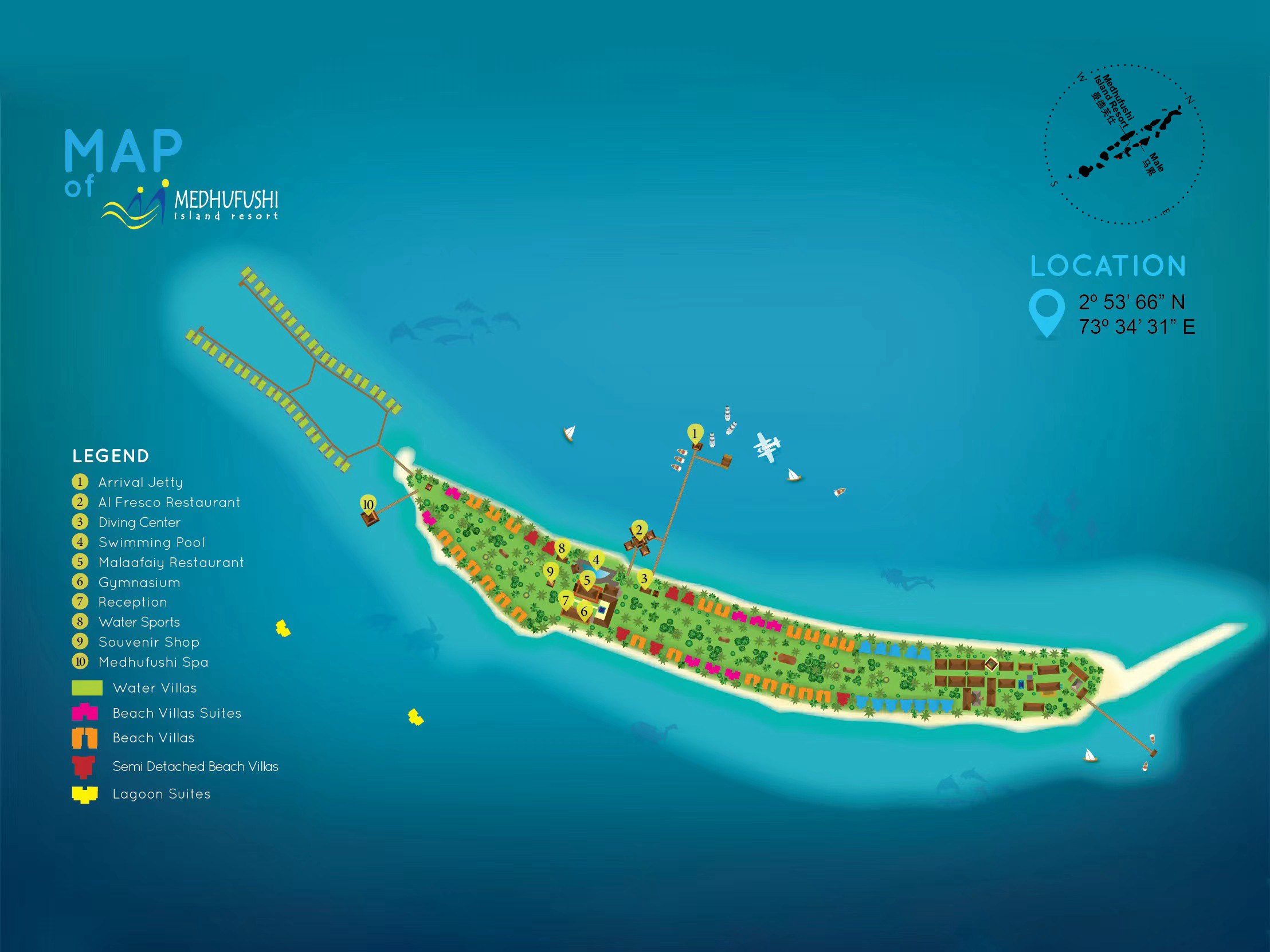 马尔代夫曼德芙仕岛Medhufushi Island Resort是一个自然宁静,平静,值得一游的岛屿度假村。乘坐水上飞机40分钟即可抵达,长约1000米,宽200米,地处宁静的美慕环礁,在经过现在经营者的全面翻新过后,该岛于2007年1月15日重新开张, 曼德芙仕岛是一个浪漫而安静的地方,而且价格并不贵。房间物有所值,有海滩上茅草顶的时髦木质小屋和的水上别墅。