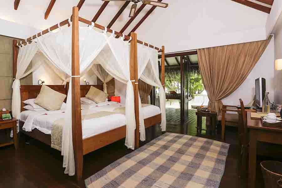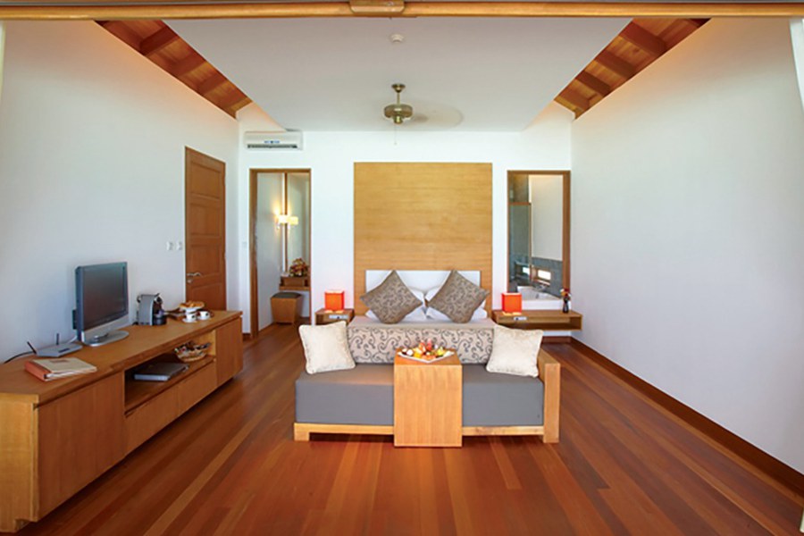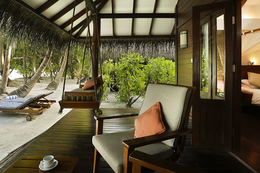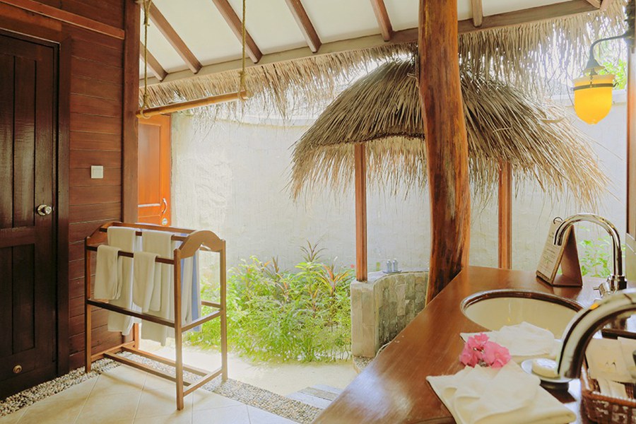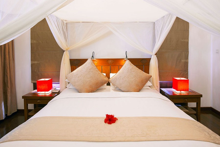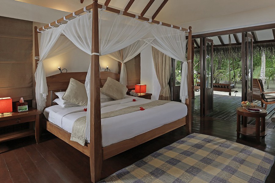 房型介绍:海滩别墅坐落在粉白色的沙滩上,周围环绕着芙蓉和海菜等郁郁葱葱的植被,提供额外的隐私。亮点包括四柱特大号床/两张单人床和室外淋浴间。其中14栋海滩别墅是半独立式的,提供了更多的空间和连接别墅的隔断门。