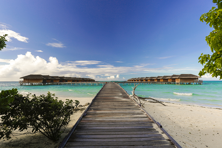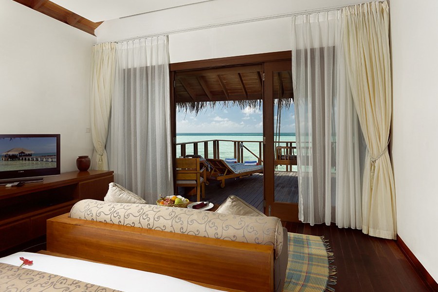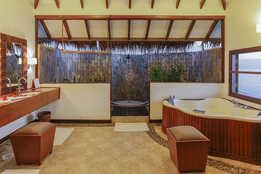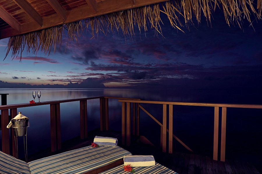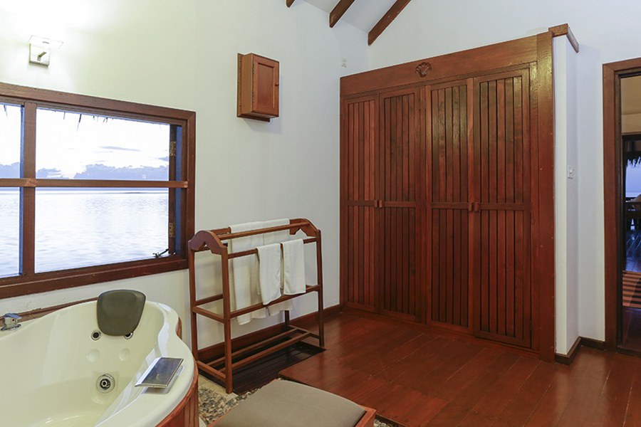 房型介绍:水上别墅位于泻湖清澈的海水上,面向日出或日落,卧室设有落地窗,可折叠在整个第四面墙上,因此您可以充分欣赏海景。它们还可以从您的私人日光浴平台通过台阶直接进入泻湖。