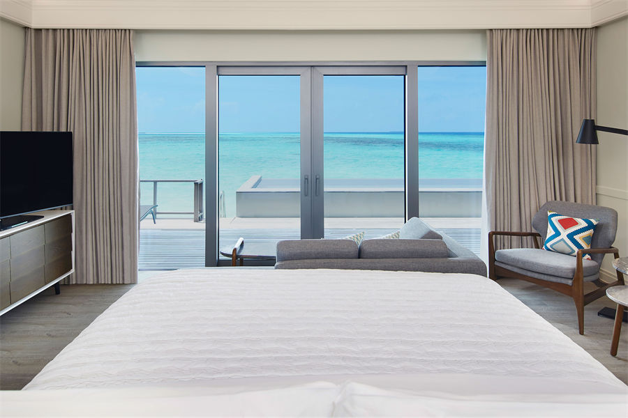 房型介绍:日出水上别墅全岛总共有43间,不带私人泳池。面积100平方米,最多可入住2大1小。配有1张大床,迷你冰箱等等设施,一应俱全