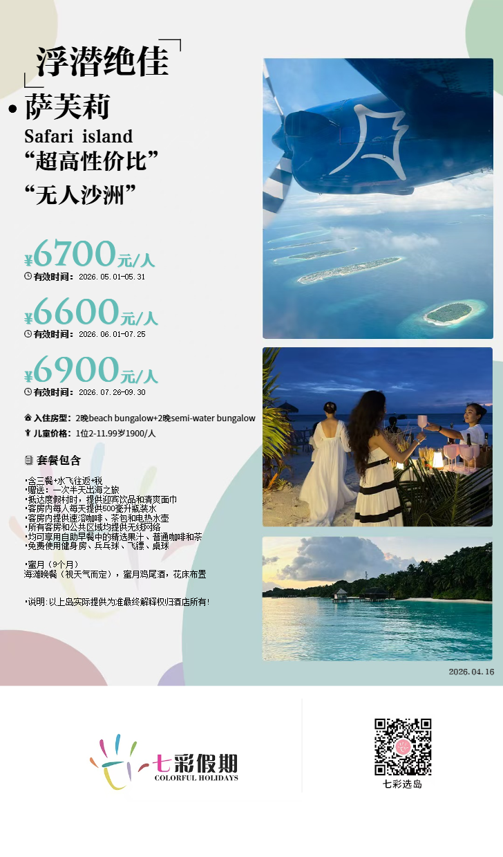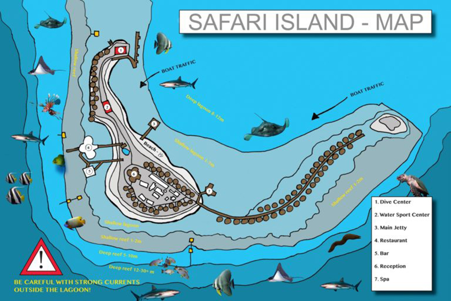 马尔代夫萨芙莉(Safari island)位于阿里环礁,距离主岛60KM乘坐水飞40分钟即可上岛,虽然是四星酒店,环境却非常好,距离鱼头珊瑚礁等著名潜水点非常近,属于把钱花在刀刃上。全岛共有84间客房可以入住,房间装修风格较为典雅,萨芙莉(Safari island)拥有1间餐厅和3家酒吧,能满足日常用餐需求,除去餐饮萨芙莉(Safari island)的娱乐设施也很不错。酒店配备了spa水疗馆、游戏室、室外游泳池、水上运动项目等等,一定会让你的假期充满欢乐。