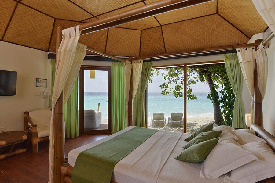 房型介绍:海滩客房设有豪华连接浴室,配有全景玻璃镜子和双盥洗盆等现代设施。客房设有一扇全玻璃门,可通往带座位的私人木制甲板。