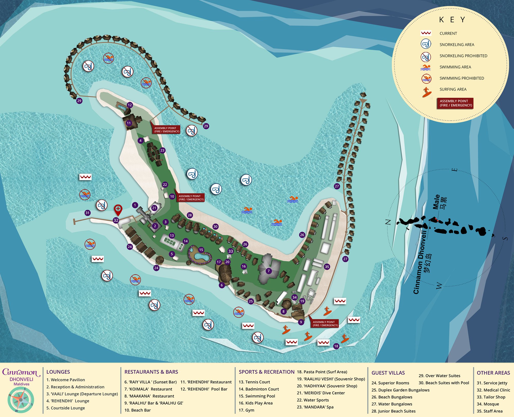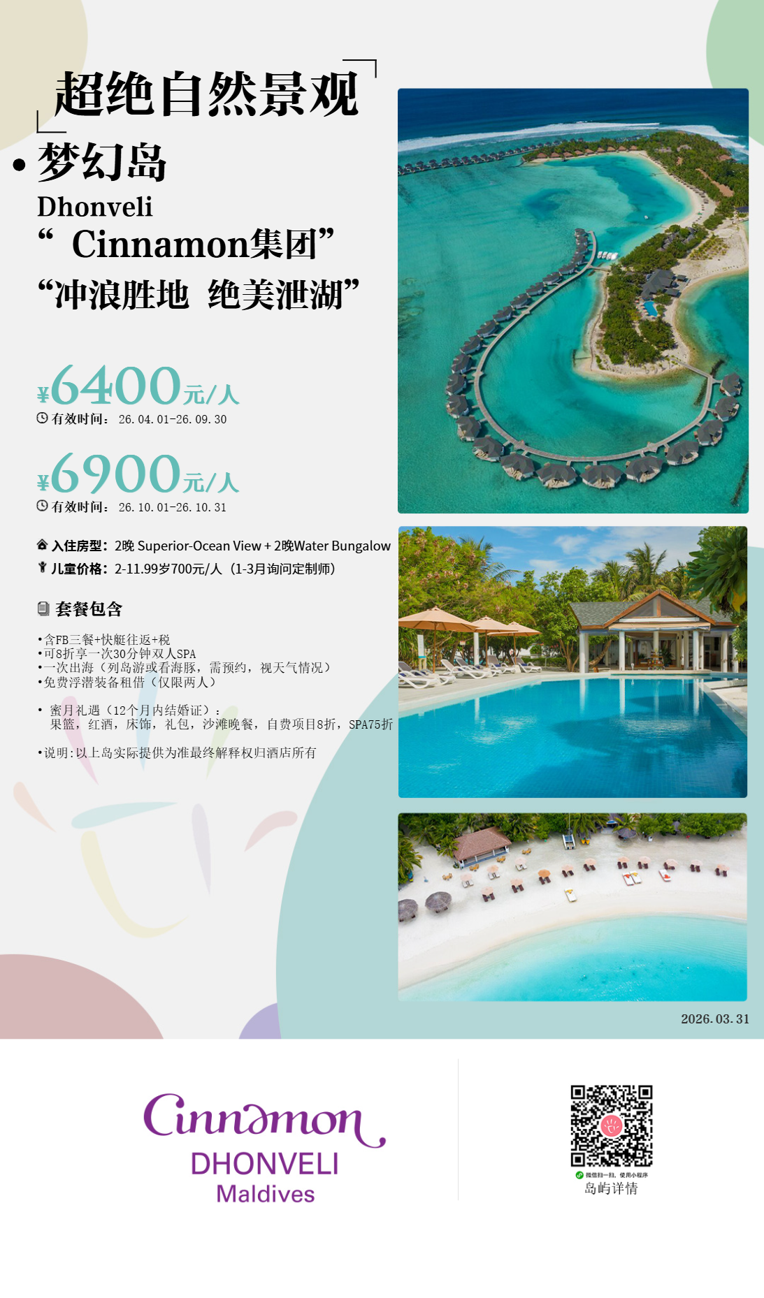 马尔代夫梦幻岛 Cinnamon Dhonveli Maldives,乘坐豪华快艇25分钟即可抵达。以Tari村庄而闻名,Tari村庄是一个世界著名的冲浪胜地,拥有主办世界冲浪竞赛的特权。2013年由希拉蒙酒店集团(Cinnamon Hotels & Resorts)接手,名称也由Chaaya Island Dhonveli变更为Cinnamon Dhonveli Maldives。在梦幻岛,您所预订的事务都将被安排得像天堂中的婚礼一样。在这里还可以参加潜水课程,去马尔代夫的一些潜水胜地潜水。 Amaan Spa温泉提供健康和美容方面的相关治疗,给冲浪者特别推荐体育按摩(Sport Massage), 放松紧绷的肌肉和身心。梦幻岛是马尔代夫最早受到冲浪者关注的度假村。在岛的周边礁可以形成非常适于冲浪的海浪,因此每到5~11月的冲浪季节,可以看到从世界各地而来的冲浪者。冲浪人数被限制在30人以内。进行冲浪的游客需要在环礁冲浪处进行预约。