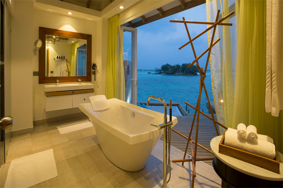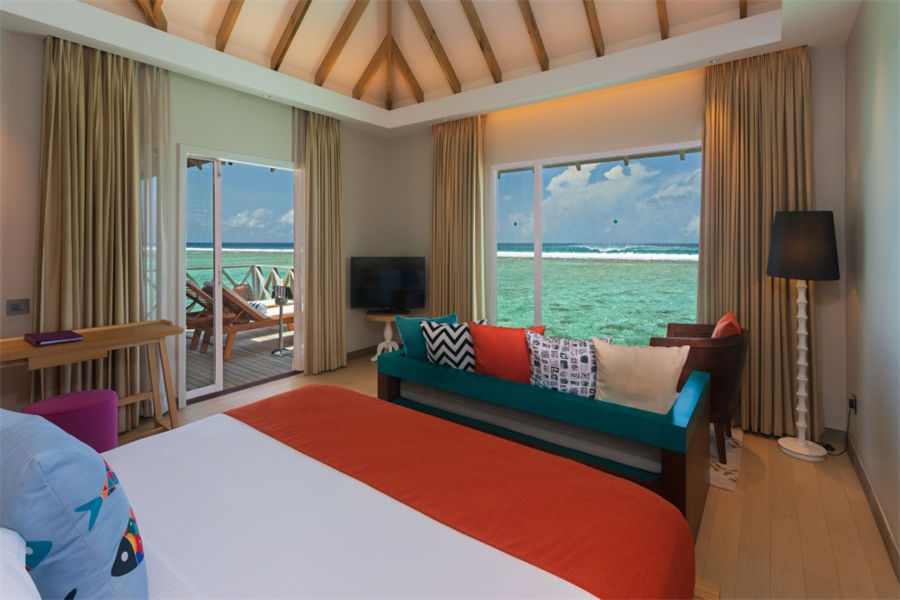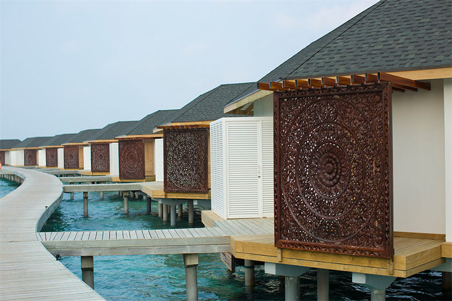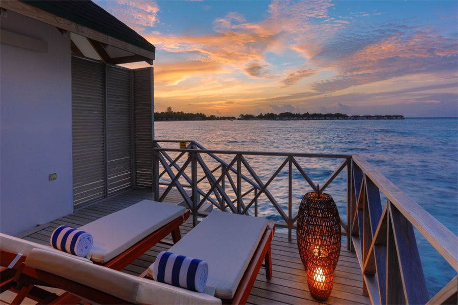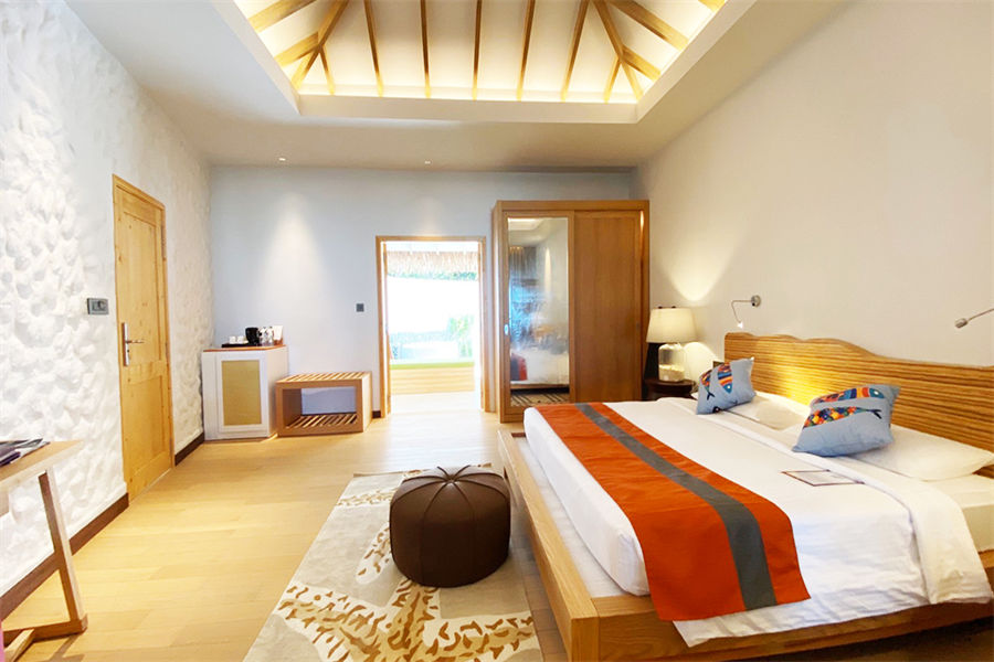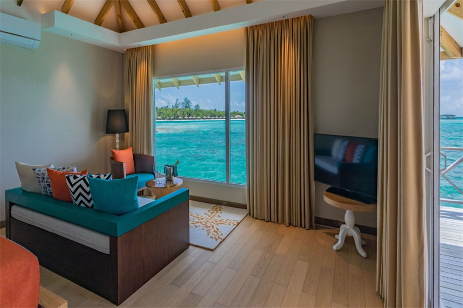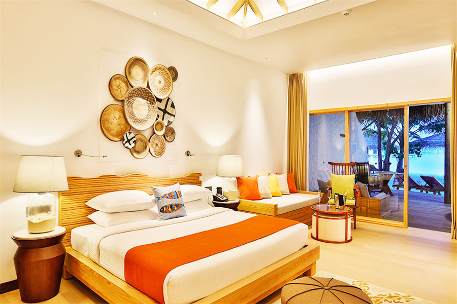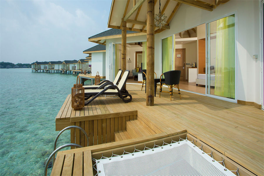 房型介绍:水上别墅位于岛的西南角,凌空于水面上。走进房间,华丽的马尔代夫雕刻、水流按摩浴缸、以及漂亮的室内设计都会让你大吃一惊。走出房间,躺在遮阳甲板上休息,让你棕褐色的皮肤晒得更完美,走下旋梯,就能够立刻投入到像水晶一样蓝的浅海里。