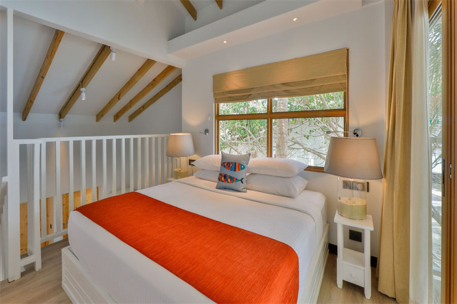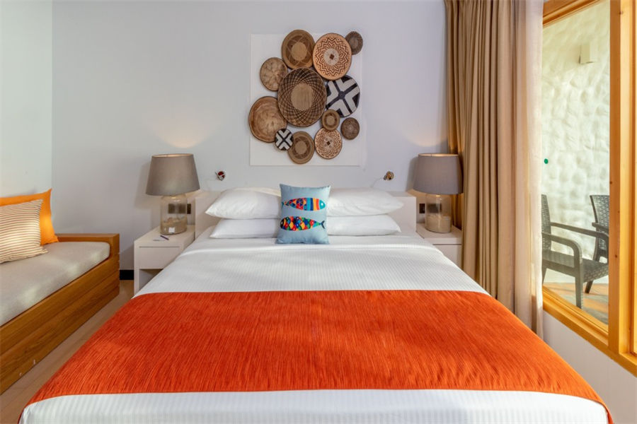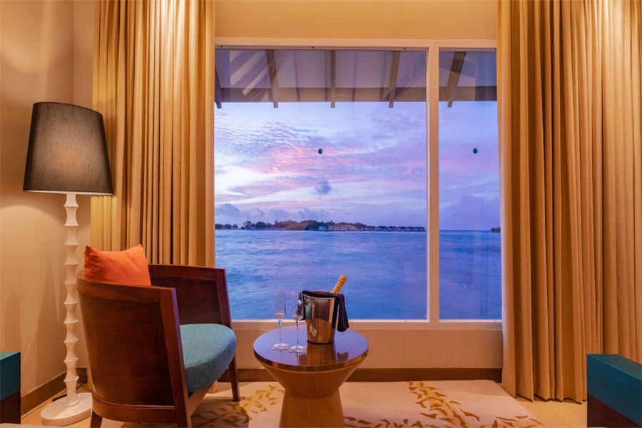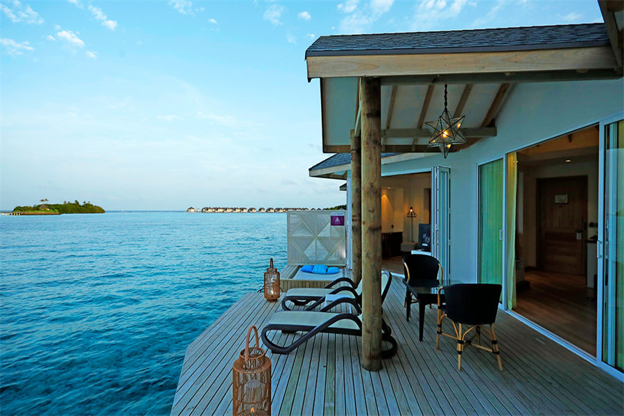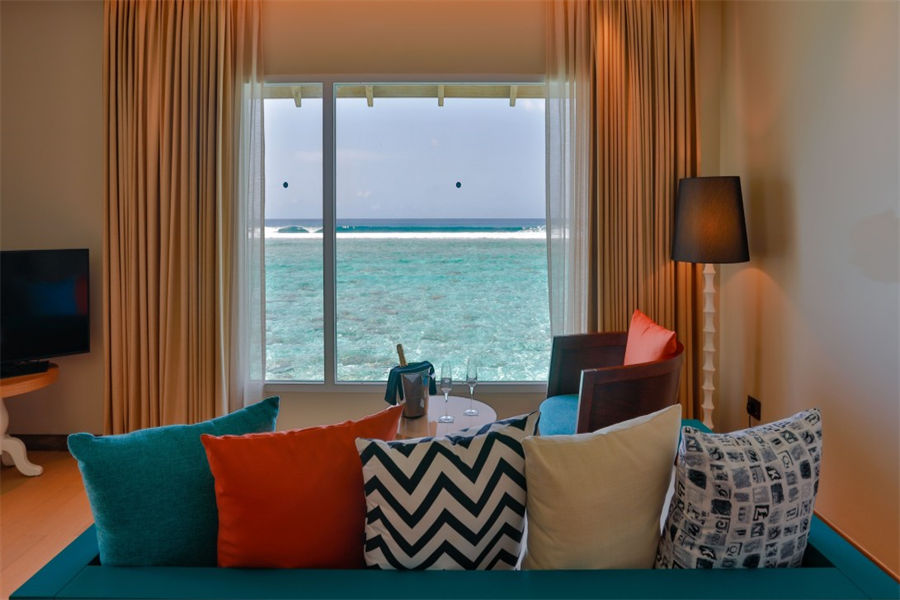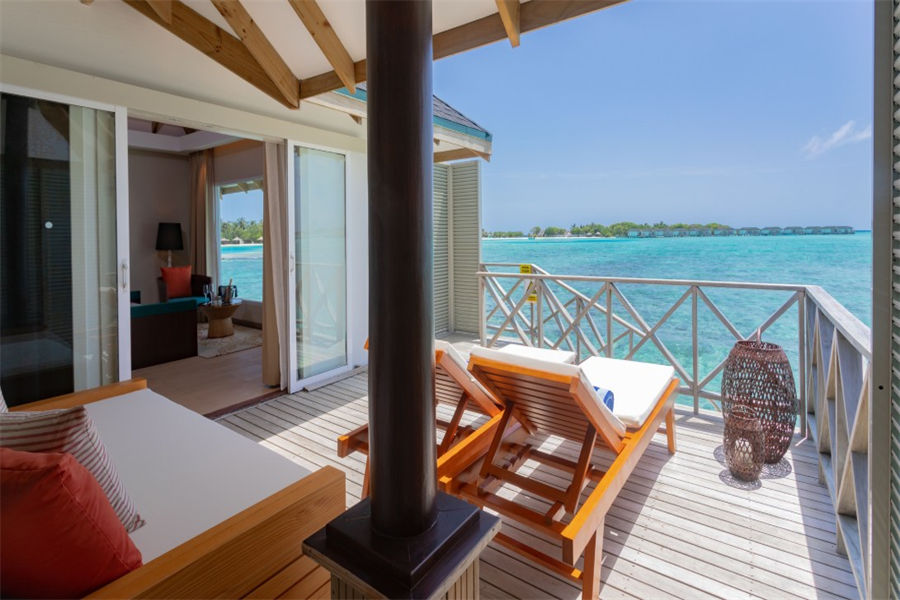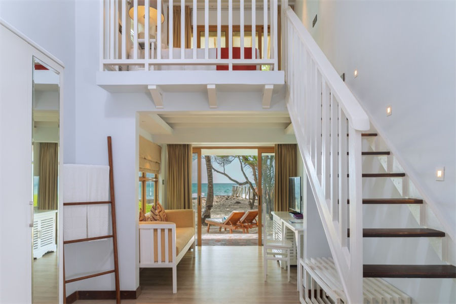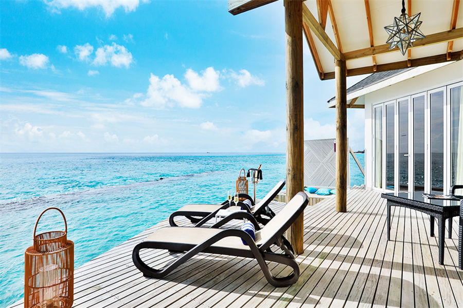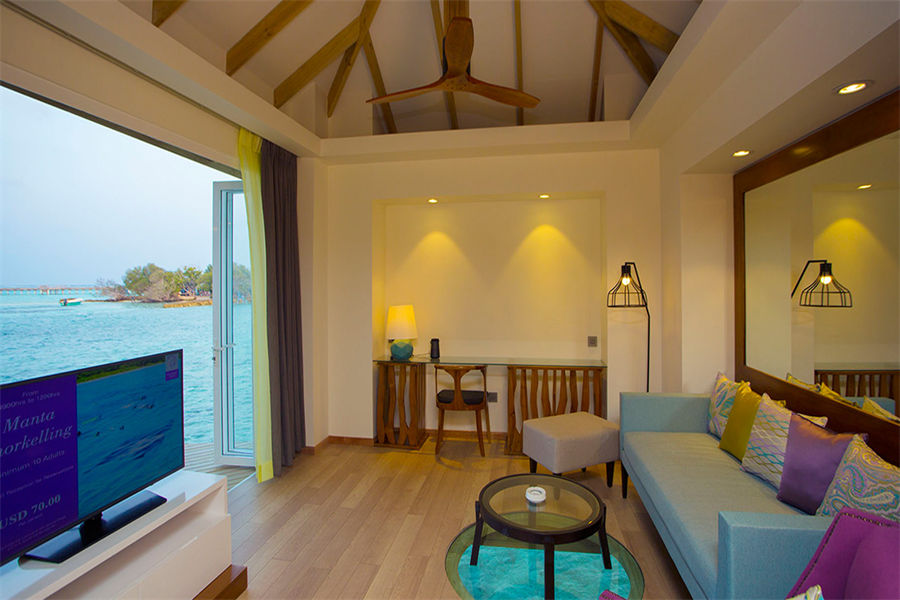 房型介绍:水上别墅位于岛的西南角,凌空于水面上。走进房间,华丽的马尔代夫雕刻、水流按摩浴缸、以及漂亮的室内设计都会让你大吃一惊。走出房间,躺在遮阳甲板上休息,让你棕褐色的皮肤晒得更完美,走下旋梯,就能够立刻投入到像水晶一样蓝的浅海里。