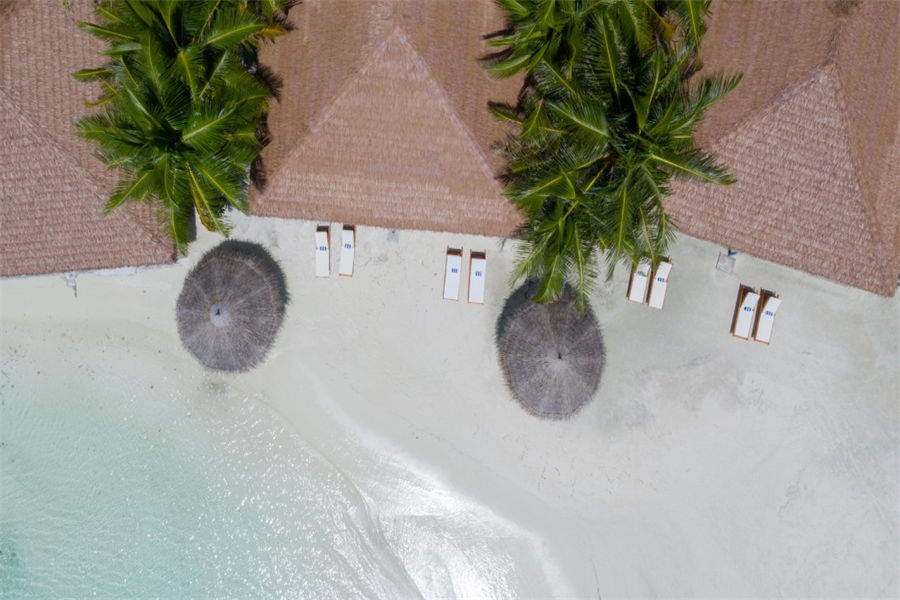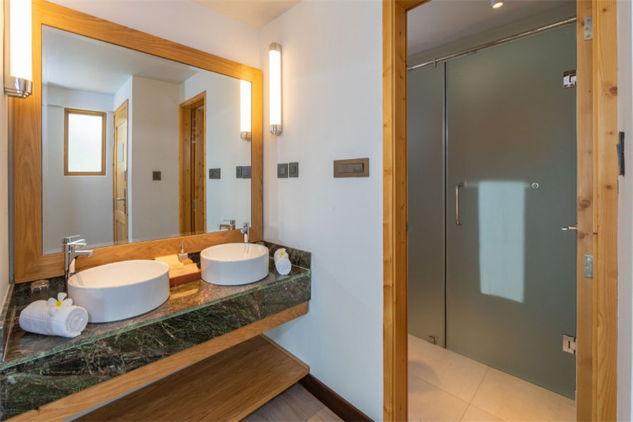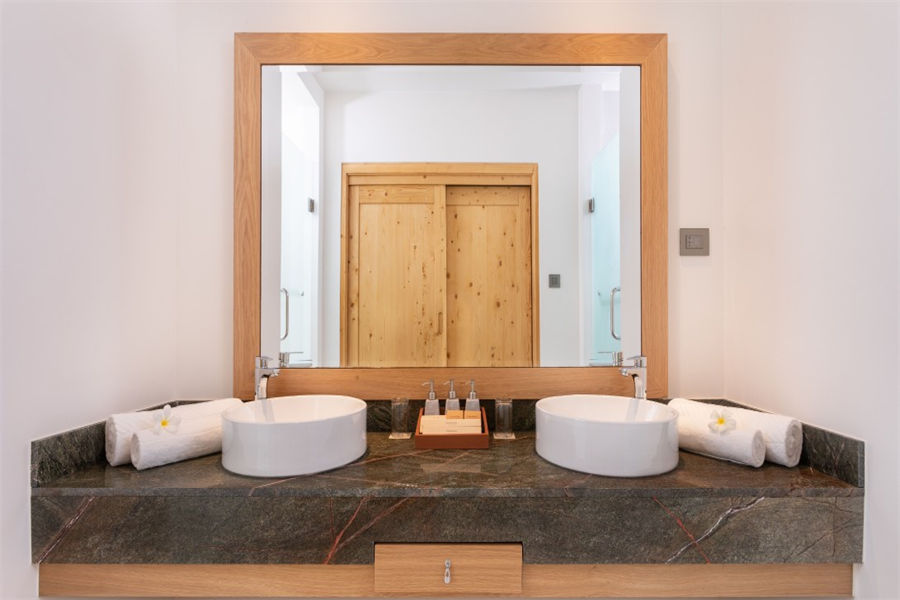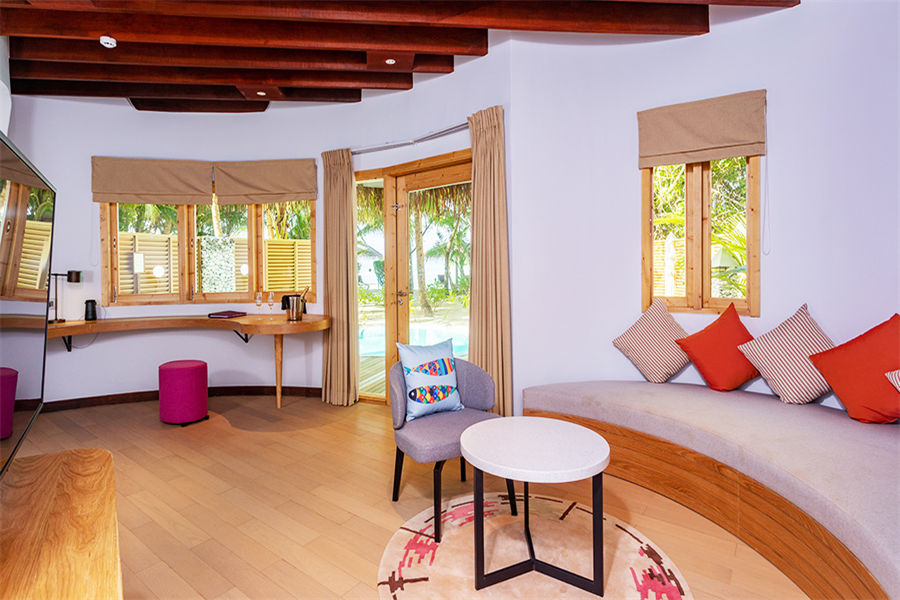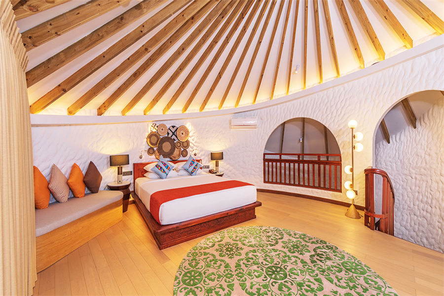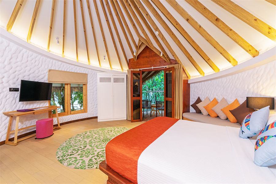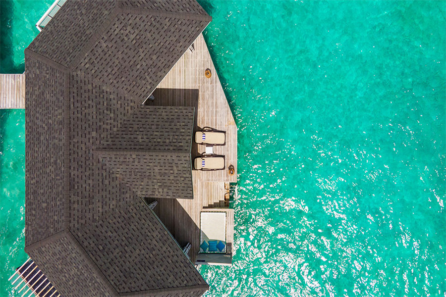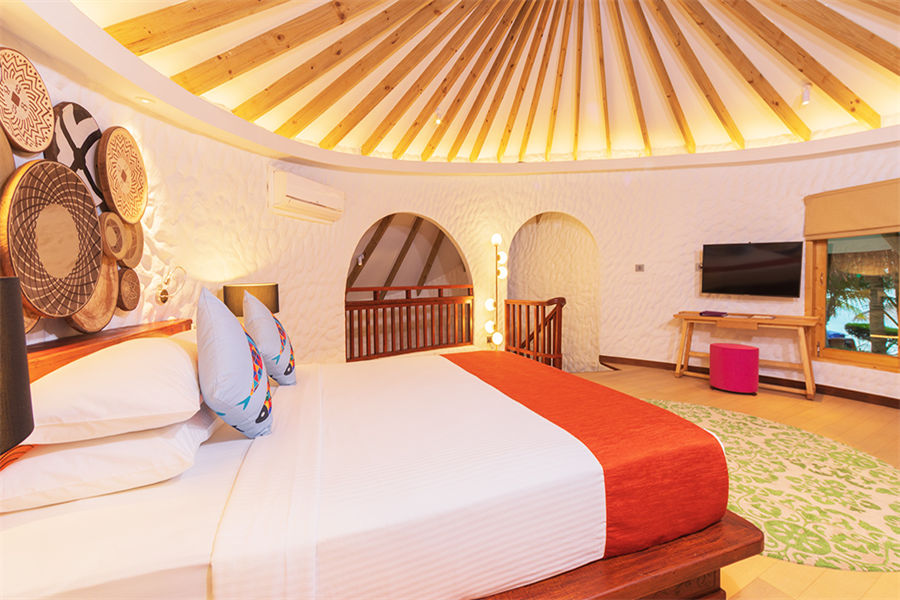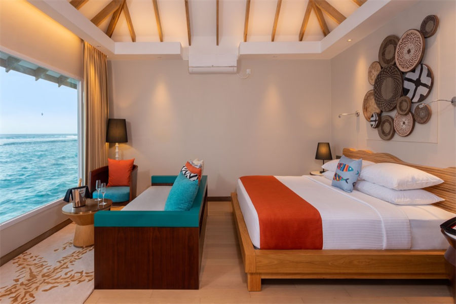 房型介绍:95㎡的水上套房,岛上有24栋。此以水下丛林为主题,无论躺在床上,在白色浴缸里沐浴,还是聚集在客厅,你都拥有海景视野。尤其是阳台,配置了直接通往泻湖的通道,以及一个水上吊床。在躺椅上伸展身体,或者在私人露天餐桌上享受客房服务——所有体验都伴随着环绕你的迷人海浪声。