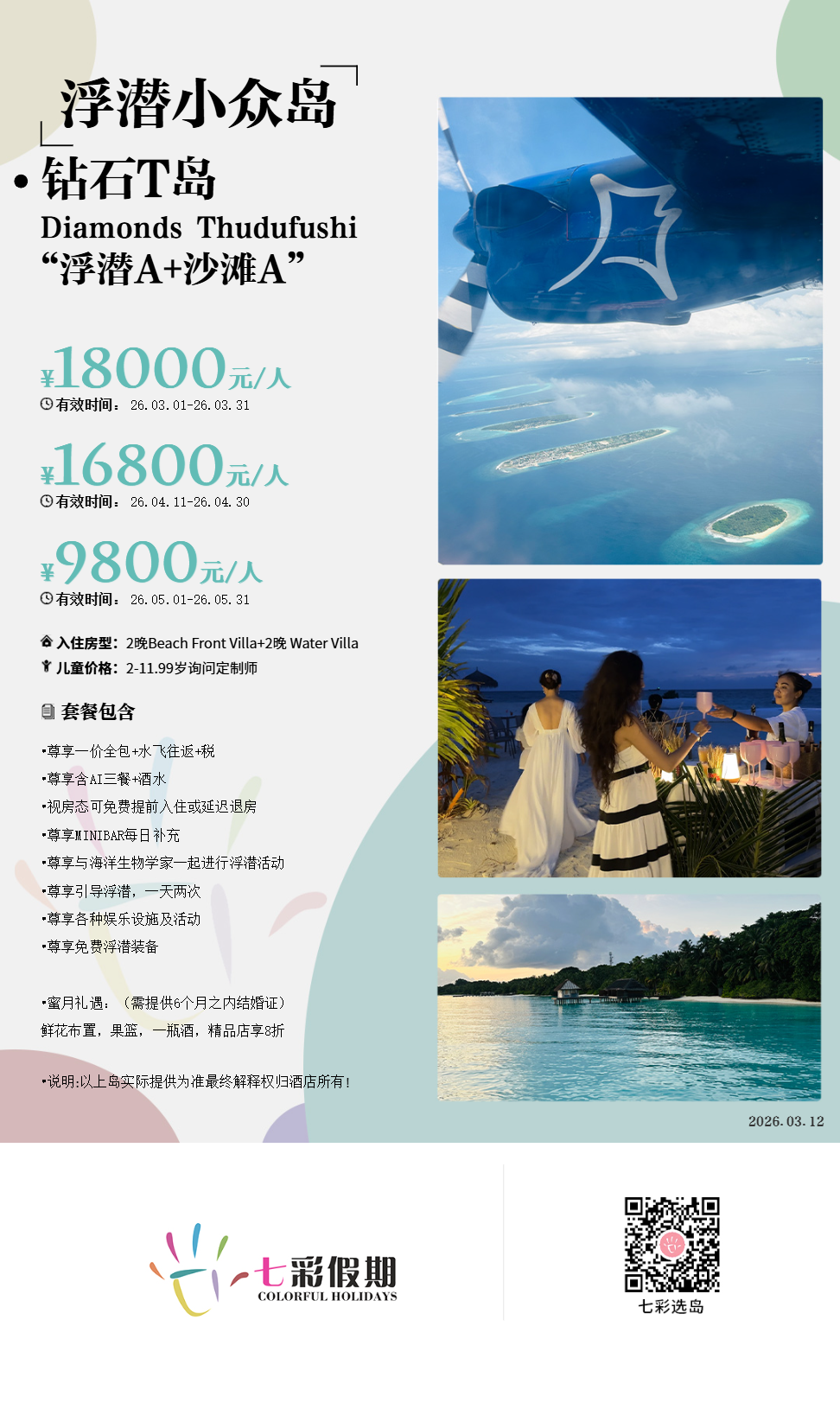 马代钻石泰达富士岛,位于阿里环礁,隶属于意大利Planhotel集团,意大利人对于美食的态度十分苛刻,一个小型岛屿竟然有5格餐厅,而且质量都很高,妥妥的吃货岛,上岛几天吃喝不重样,岛屿于2007年进行了翻修,风格不算落后,岛屿非常美丽,沙滩周围是茂盛的绿色植物,整座岛有45间沙滩和25格水上别墅,岛屿的浮潜环境非常好A级的浮潜和A级的沙滩,岛屿边缘有很多环礁,随时可以进行浮潜,适合蜜月,不适合亲子游。