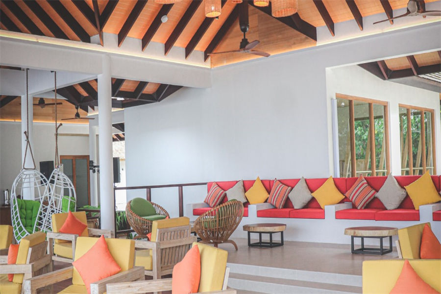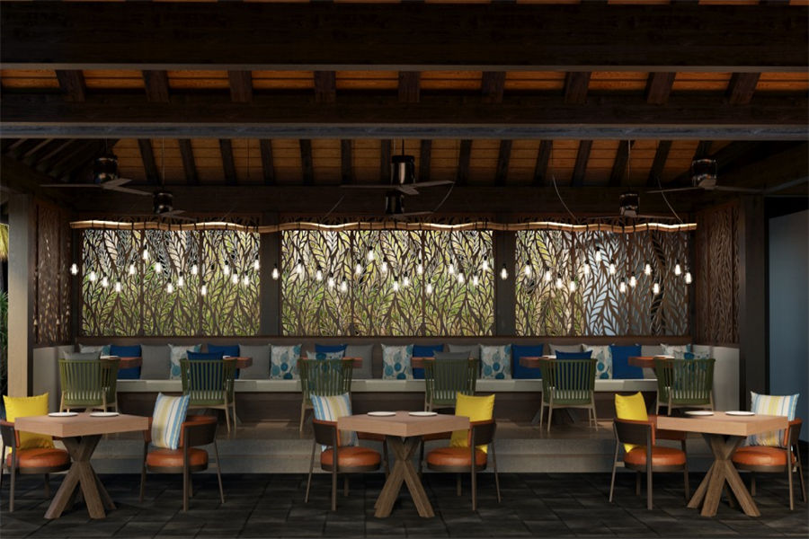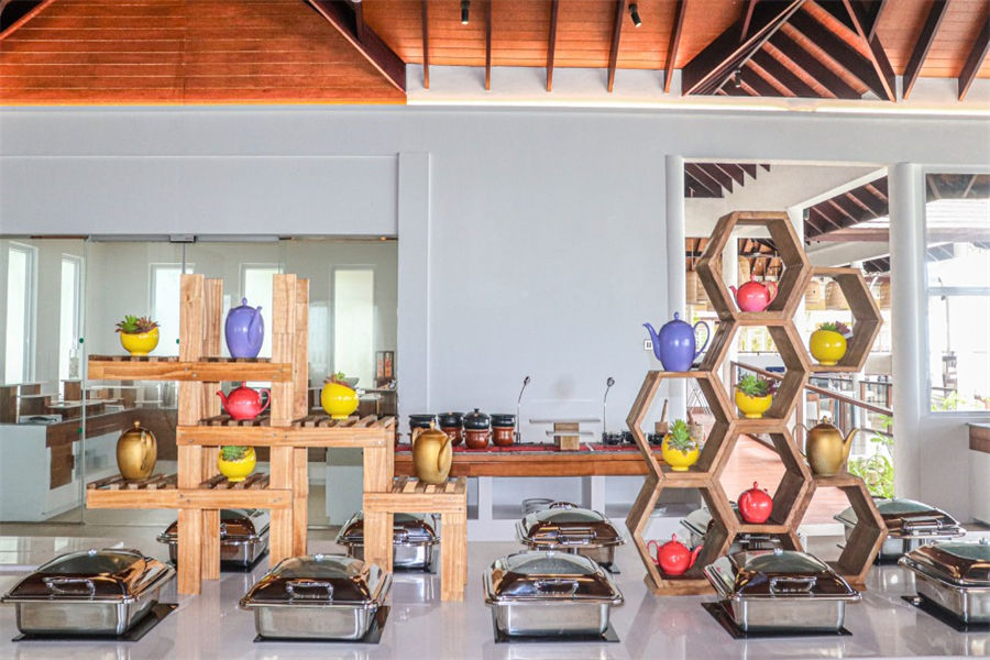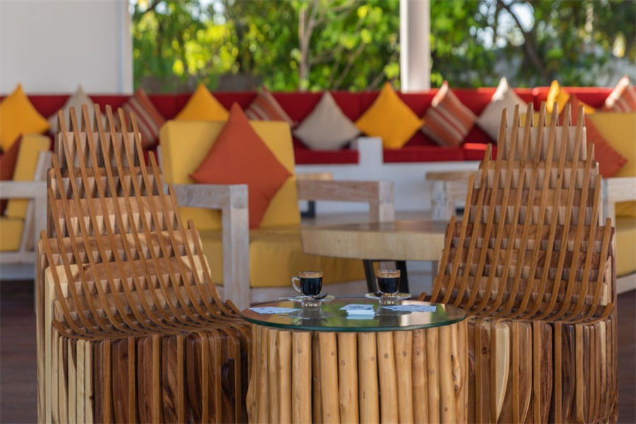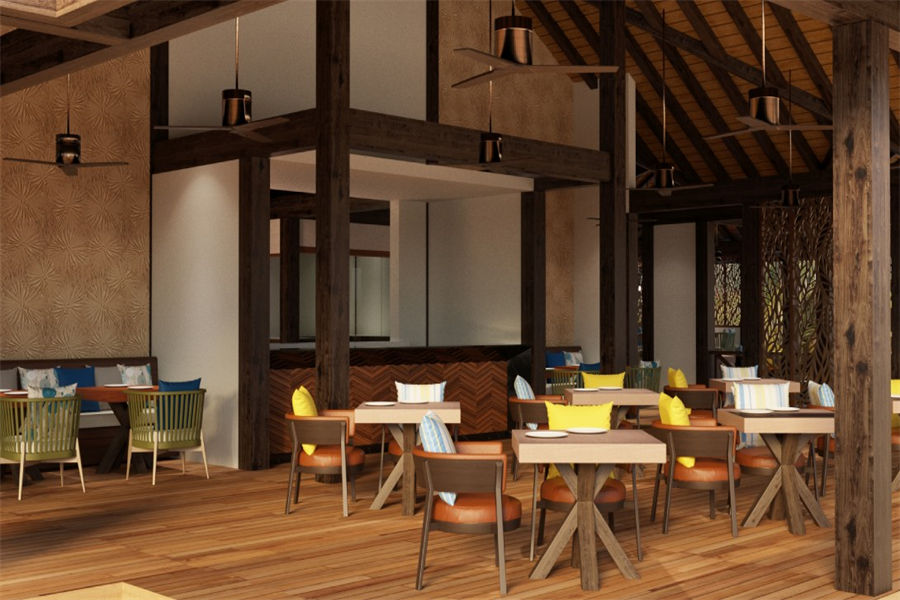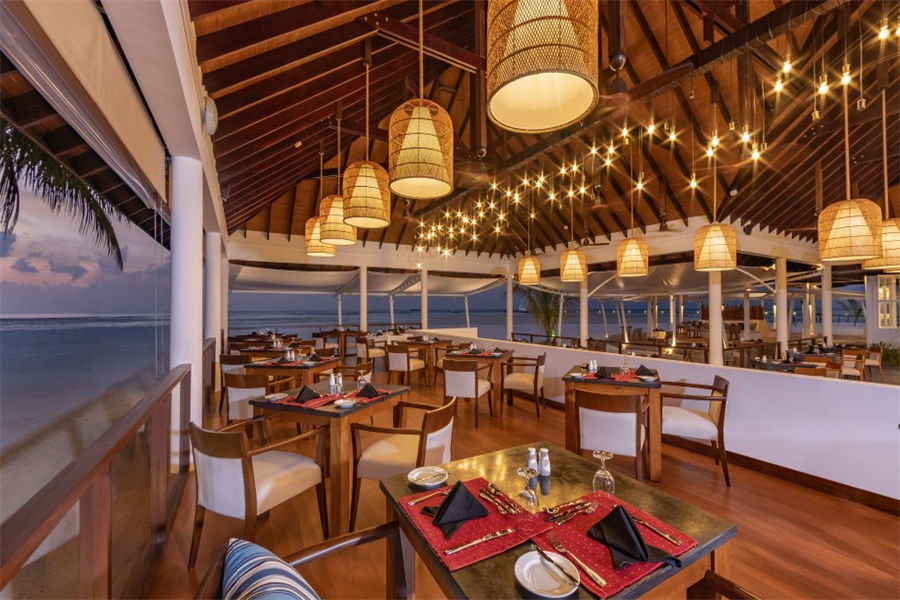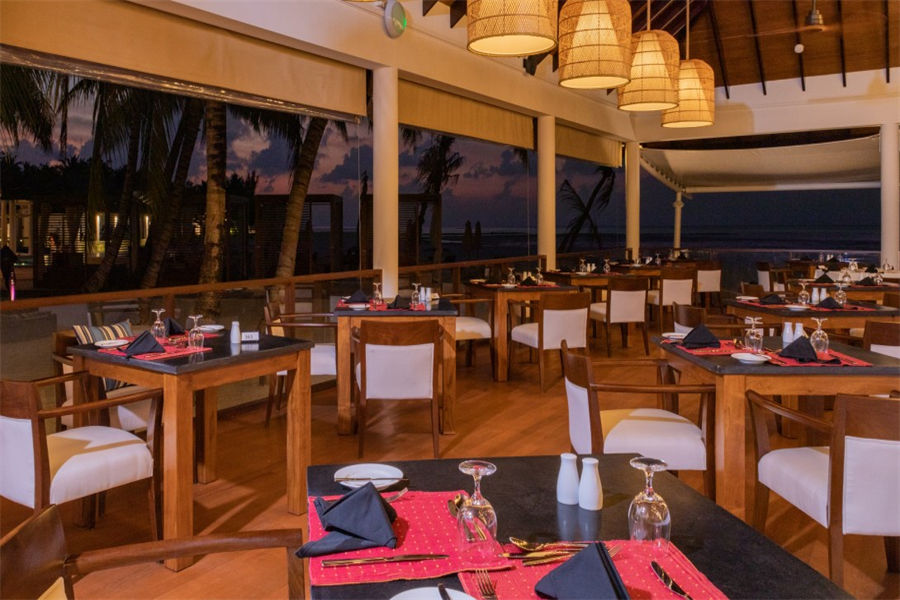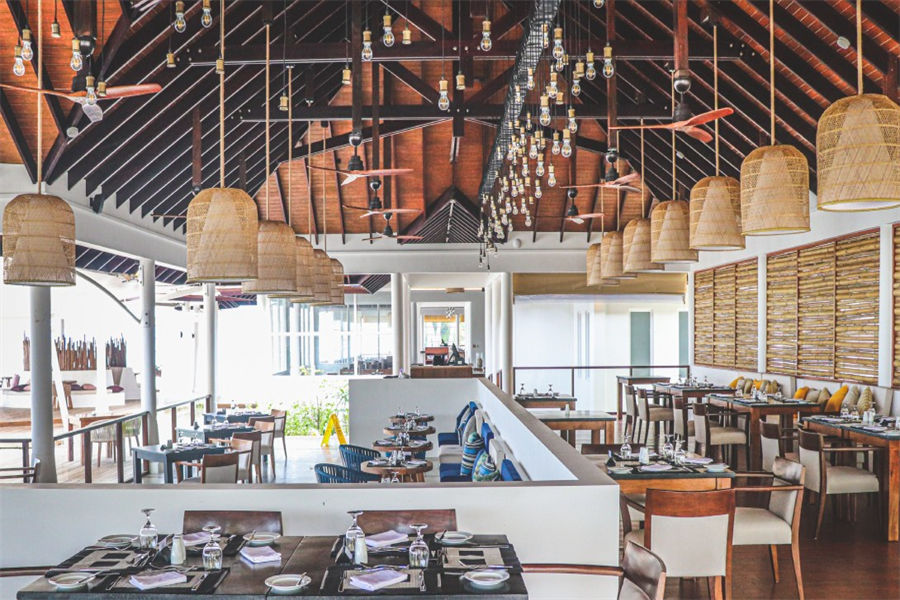餐厅介绍:圆形的Malaafaiy餐厅是主岛的主餐厅。每个房间对应数字相同的餐桌,餐厅环境优美,干净、整洁而且环保。主岛的所有客人都可以享用每天三次的自助餐。