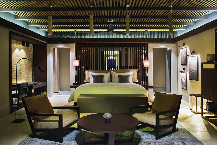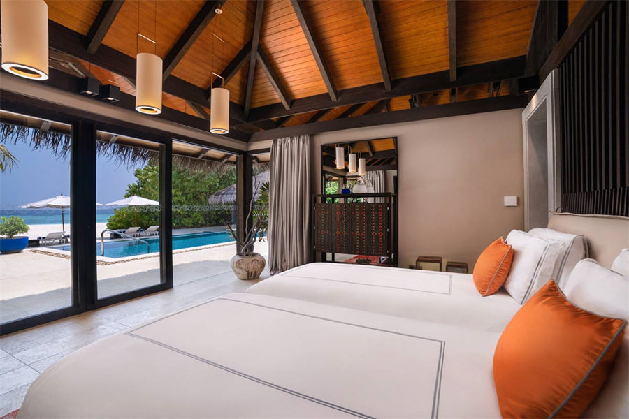 房型介绍:全岛仅7栋的沙滩泳池屋面积581㎡。静静地卧在葱笼的植物族群中,两侧是随风轻轻摇曳的棕榈树,双卧海滩住屋是家庭下榻的理想寓所。宽敞的起居区白天可供休憩放松,傍晚则是热闹的社交活动场所。起居室与配备有酒吧和高脚凳的厨房区彼此相连,为正式招待客人或非正式的社交活动 (仅提供零食或膳食) 提供理想地点。卧室的装修采用百叶窗式木材和天然材料,灯盏从拱形天花板上悬挂而下,让光线和私密兼具。藤条摇椅为典雅的装饰风格增添些许趣味元素。户外露台十分宽敞,设有一座大型私人泳池和精心摆放的躺椅,从独立的户外用餐平台上可观赏到漓湖的全景风貌。