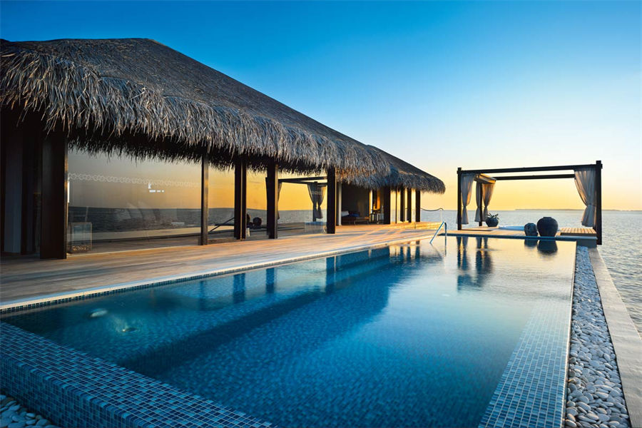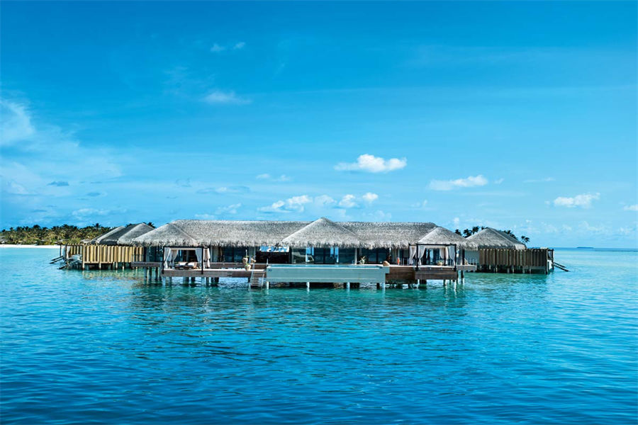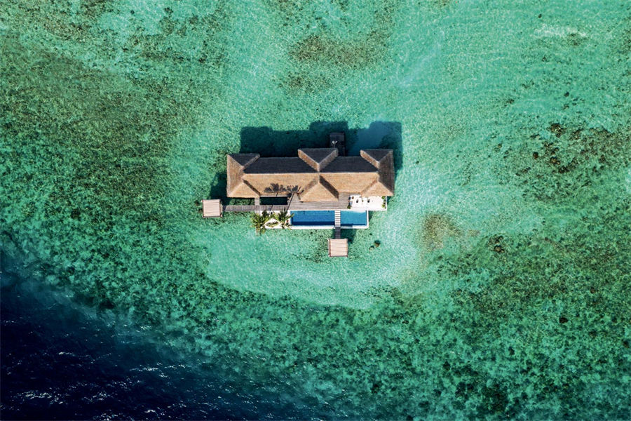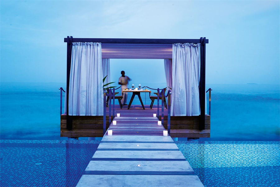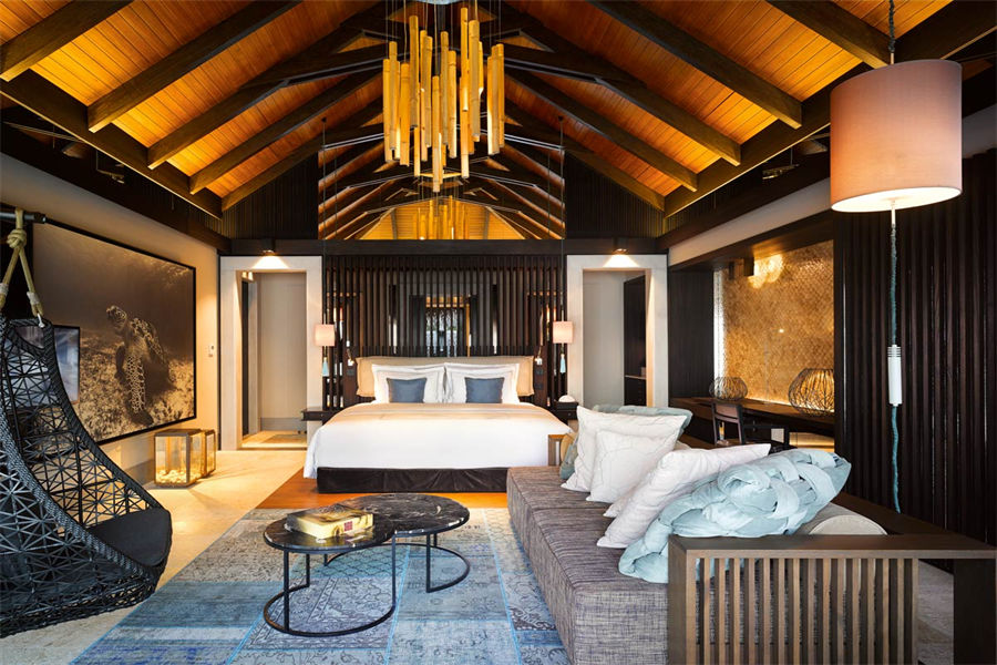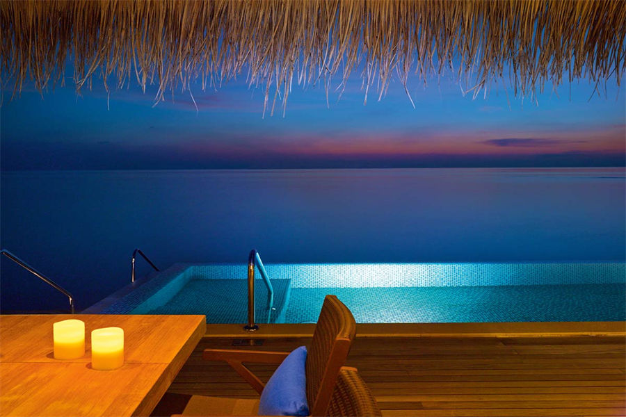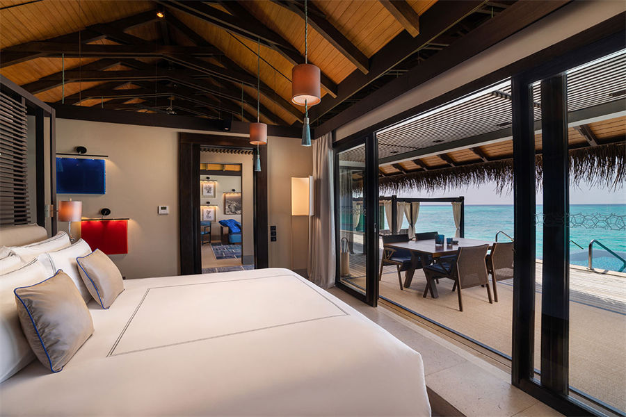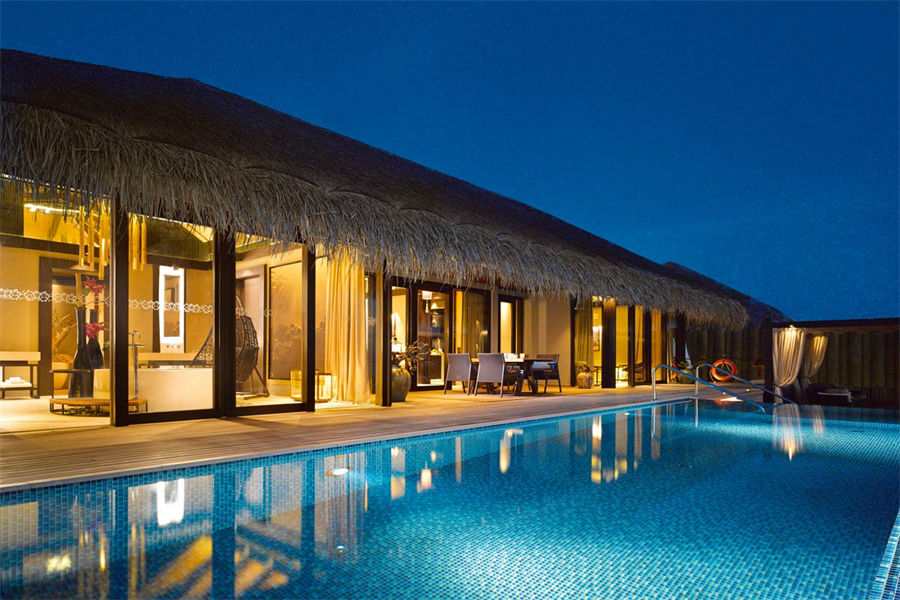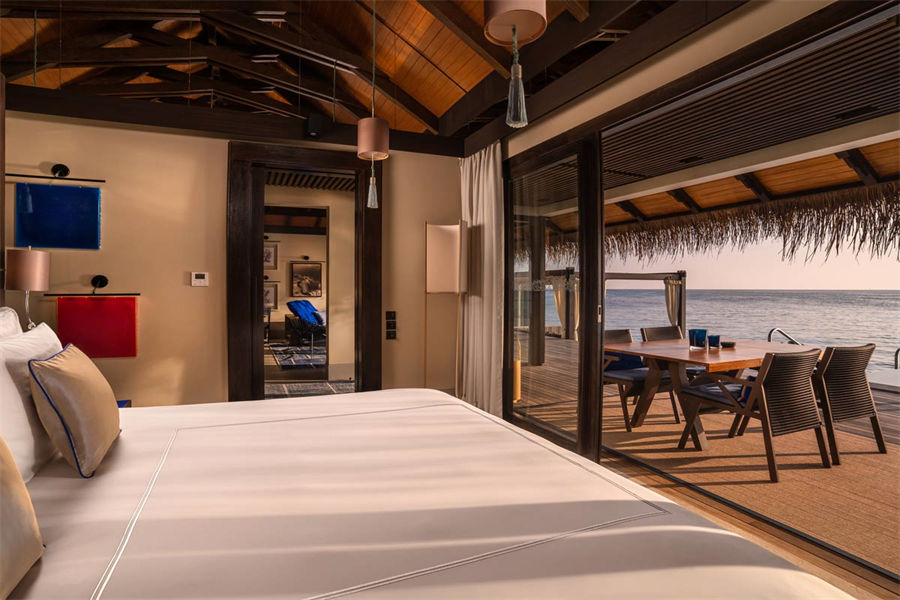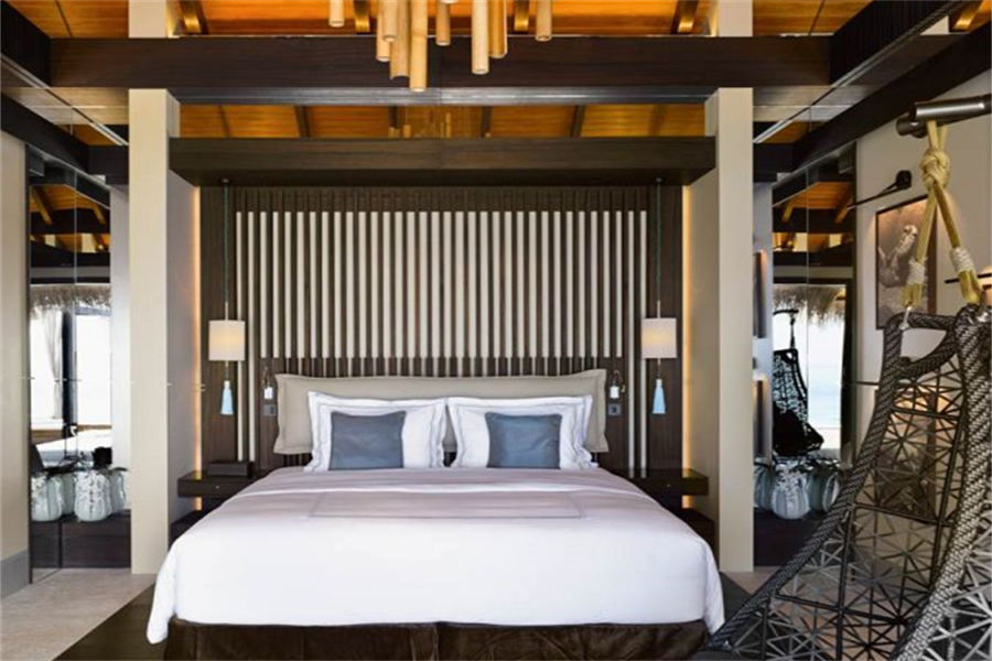 房型介绍:全岛仅1栋的浪漫泳池住宅面积598㎡,这座单卧别墅位于泻湖之上,极具私密性,仅能靠船舶抵达,拥有一望无垠的宽阔海洋视野和其他地方无法企及的私密与浪漫,是蜜月新人或寻找终极奢华客人的理想之选,更有私人厨师和管家提供无微不至的贴心服务。所有房间均可通往露台,按摩浴缸、泳池、阳光甲板和下沉式浴池一应俱全,从不同角度可观赏到变化多端的海平线风光。傍晚,来到水下用餐区或水上用餐凉亭中一边享用美食,一边观赏落日美景,或是舒适地躺在豪华躺椅上,漫不经心地啜一口饮料,都惬意非凡。室内采用天然材料和中性色调装饰,时而跳入眼帘的印度扎染布元素或动物印花都洋溢着趣味。别墅内配备私人健身房和水疗护理房,方便与舒适的私密享受让人不舍离开。