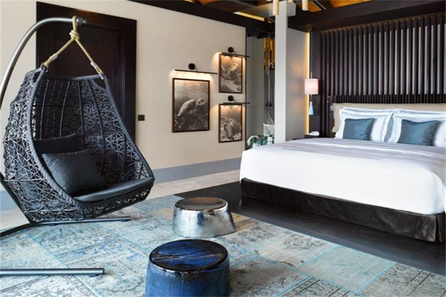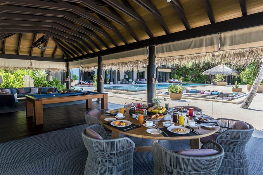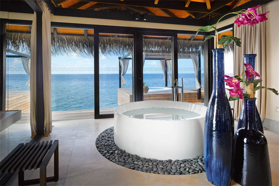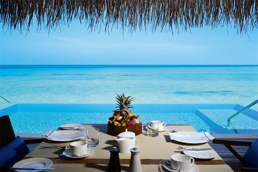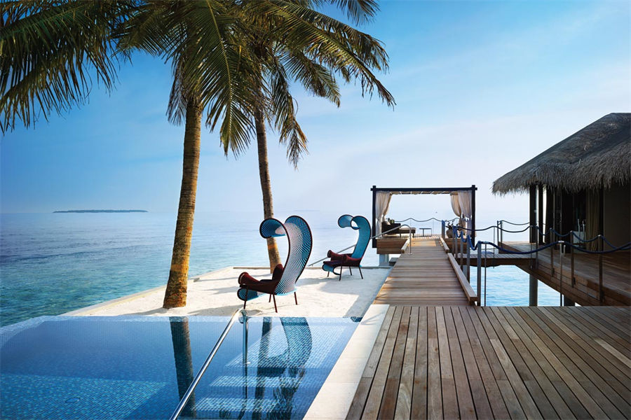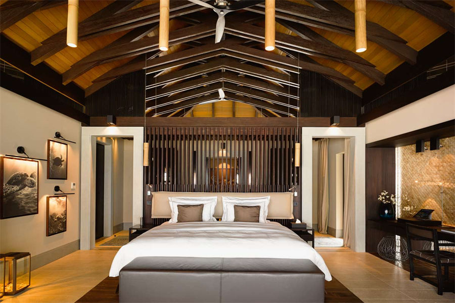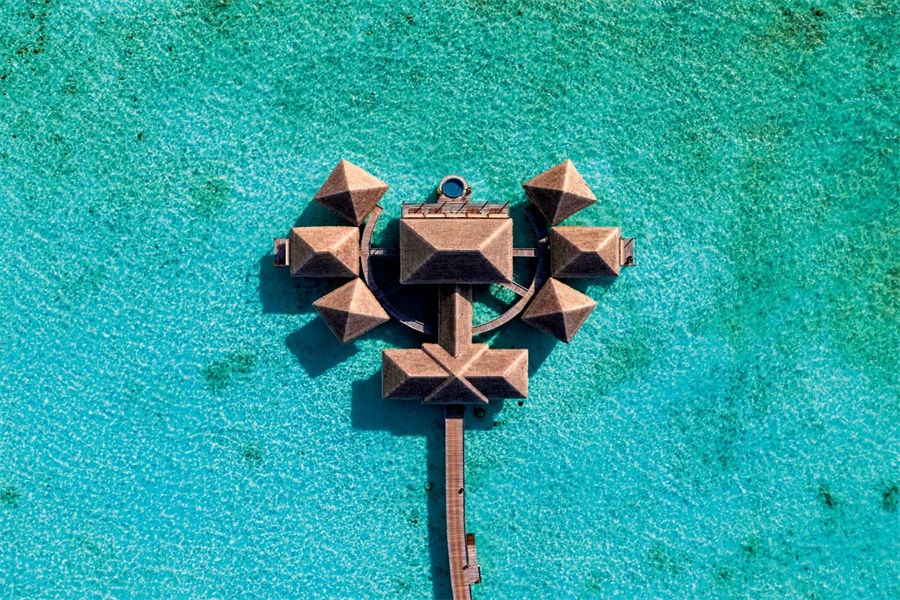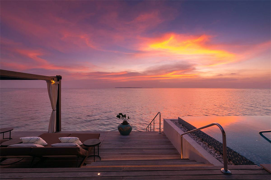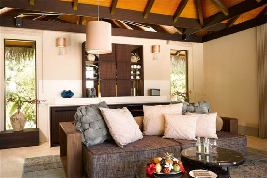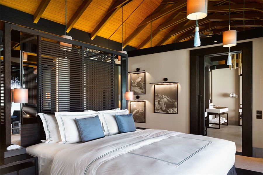 房型介绍:全岛仅1栋的浪漫泳池住宅面积598㎡,这座单卧别墅位于泻湖之上,极具私密性,仅能靠船舶抵达,拥有一望无垠的宽阔海洋视野和其他地方无法企及的私密与浪漫,是蜜月新人或寻找终极奢华客人的理想之选,更有私人厨师和管家提供无微不至的贴心服务。所有房间均可通往露台,按摩浴缸、泳池、阳光甲板和下沉式浴池一应俱全,从不同角度可观赏到变化多端的海平线风光。傍晚,来到水下用餐区或水上用餐凉亭中一边享用美食,一边观赏落日美景,或是舒适地躺在豪华躺椅上,漫不经心地啜一口饮料,都惬意非凡。室内采用天然材料和中性色调装饰,时而跳入眼帘的印度扎染布元素或动物印花都洋溢着趣味。别墅内配备私人健身房和水疗护理房,方便与舒适的私密享受让人不舍离开。
