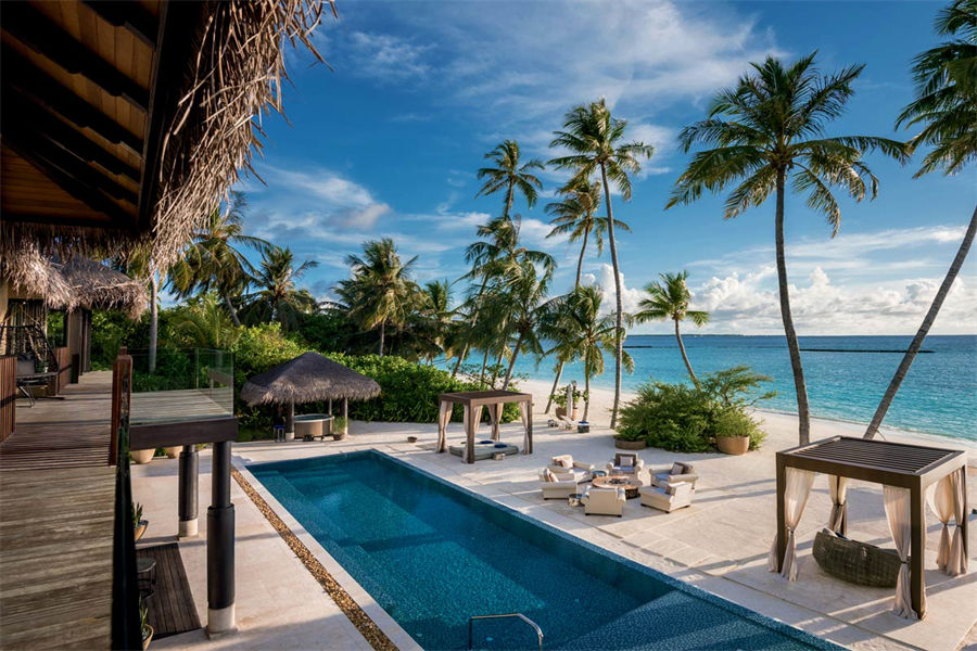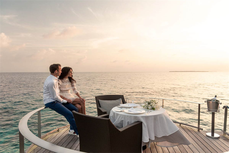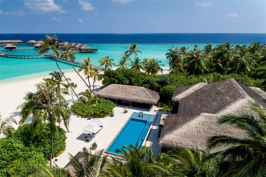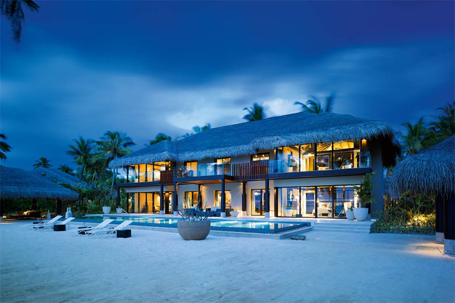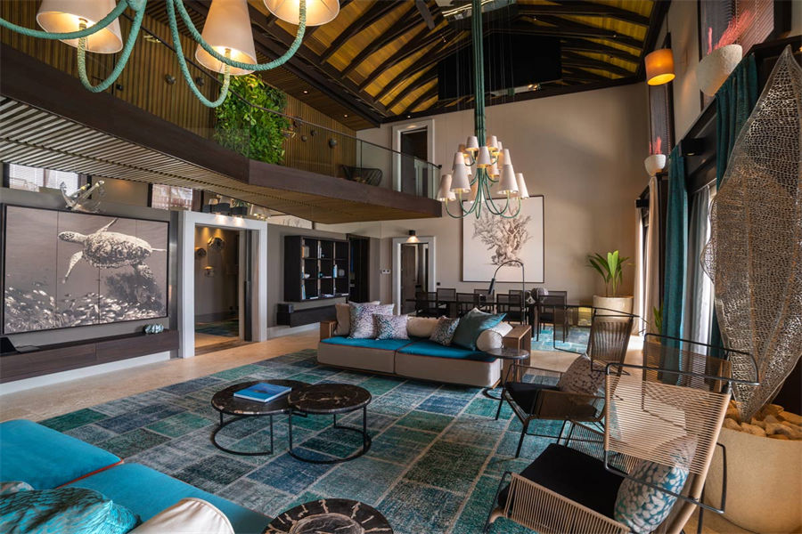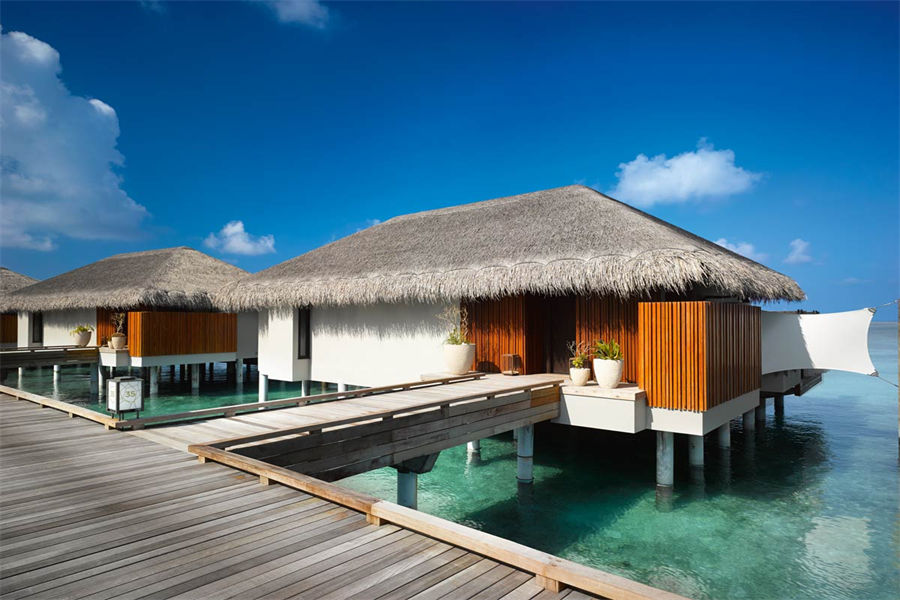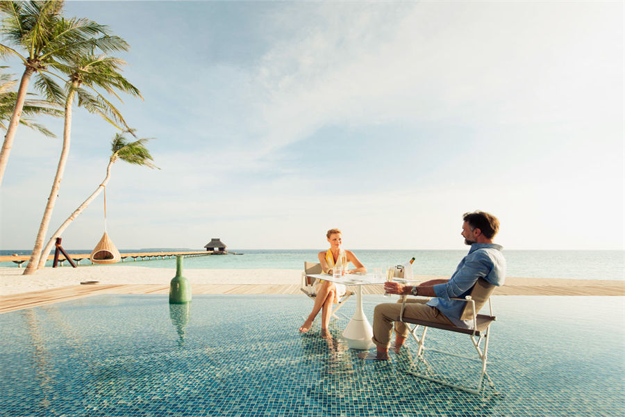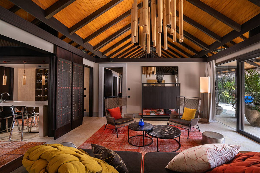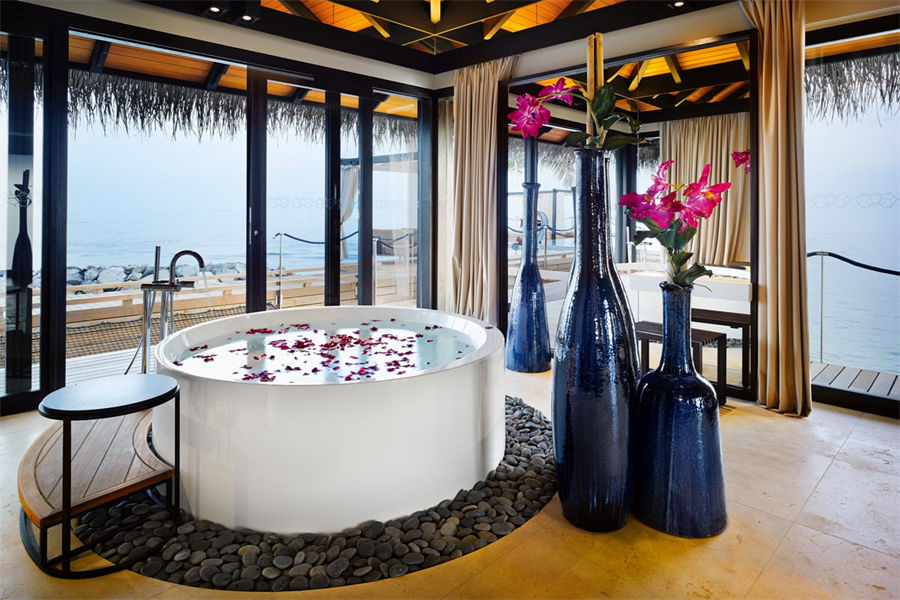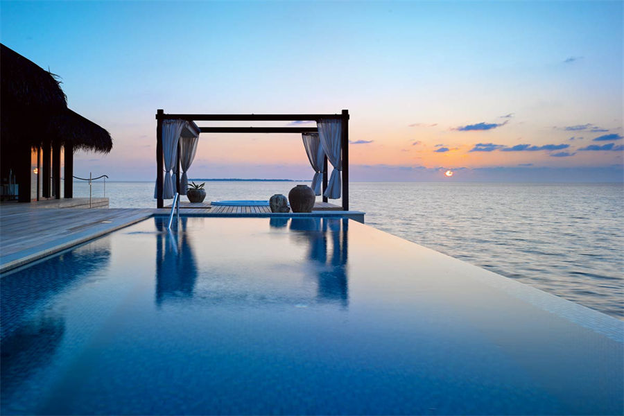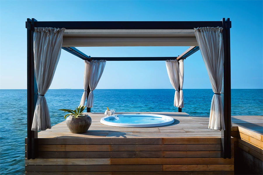 房型介绍:全岛仅1栋的浪漫泳池住宅面积598㎡,这座单卧别墅位于泻湖之上,极具私密性,仅能靠船舶抵达,拥有一望无垠的宽阔海洋视野和其他地方无法企及的私密与浪漫,是蜜月新人或寻找终极奢华客人的理想之选,更有私人厨师和管家提供无微不至的贴心服务。所有房间均可通往露台,按摩浴缸、泳池、阳光甲板和下沉式浴池一应俱全,从不同角度可观赏到变化多端的海平线风光。傍晚,来到水下用餐区或水上用餐凉亭中一边享用美食,一边观赏落日美景,或是舒适地躺在豪华躺椅上,漫不经心地啜一口饮料,都惬意非凡。室内采用天然材料和中性色调装饰,时而跳入眼帘的印度扎染布元素或动物印花都洋溢着趣味。别墅内配备私人健身房和水疗护理房,方便与舒适的私密享受让人不舍离开。