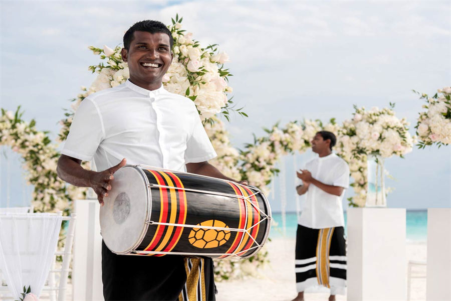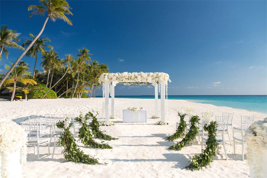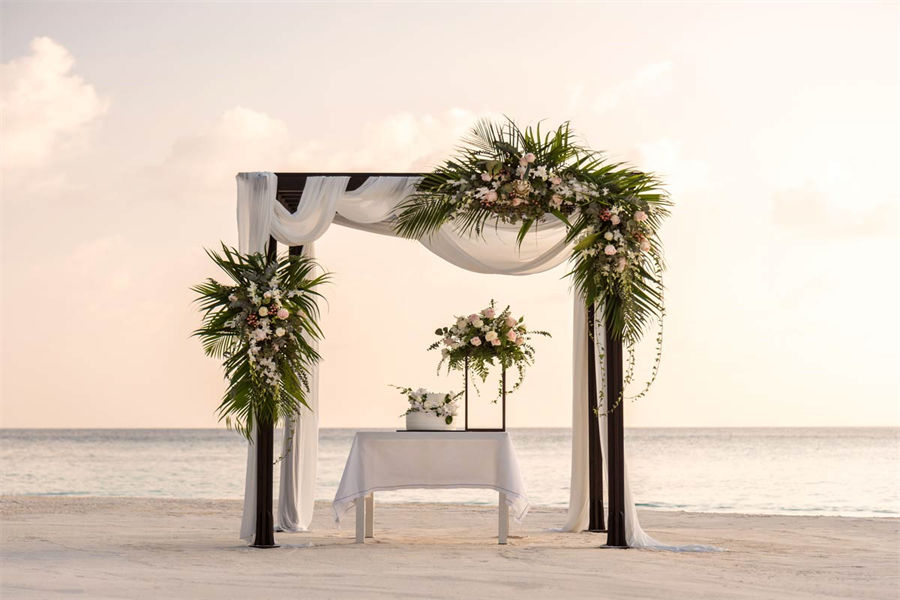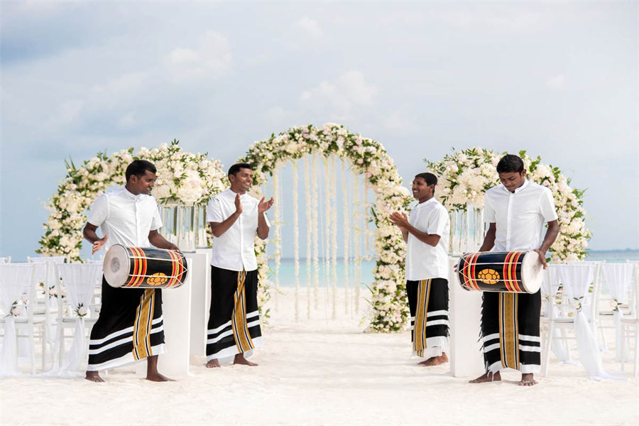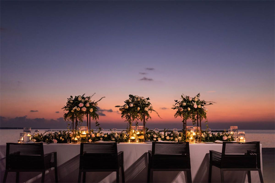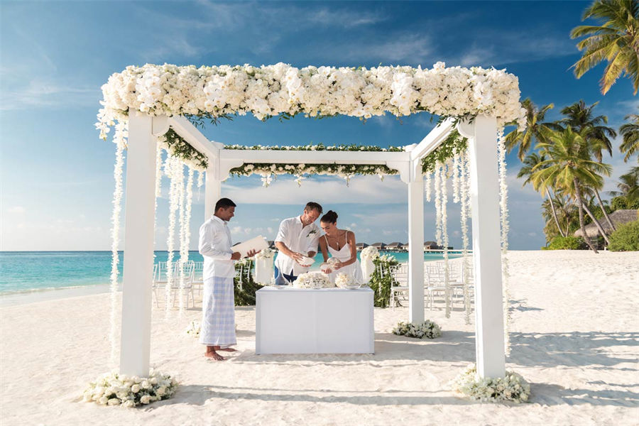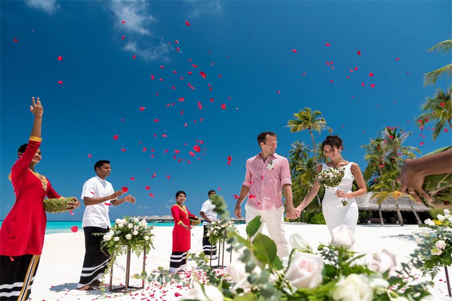 活动简介:面向浩瀚壮美的印度洋,独特的Velaa婚礼专为独特的您而设计。漫步走过白色沙滩上鲜花铺就的走道,新郎新娘在五彩缤纷的撒花中共许爱的誓言。此时,丰盛的婚宴已经准备就绪。在您与宾客们觥筹交错之际,我们的大厨将准备汇聚当地美食的独特烧烤,为你们奉上一段温馨浪漫的休闲时光。精致优雅的鲜花装饰我们会精心布置每一张餐桌,同时安排DJ或乐队演奏完美应景的舞蹈音乐。烟火表演、激光表演或其他私人订制表演将为您的婚礼增添永恒的美好记忆,完美开启您在这座人间天堂的蜜月之旅。