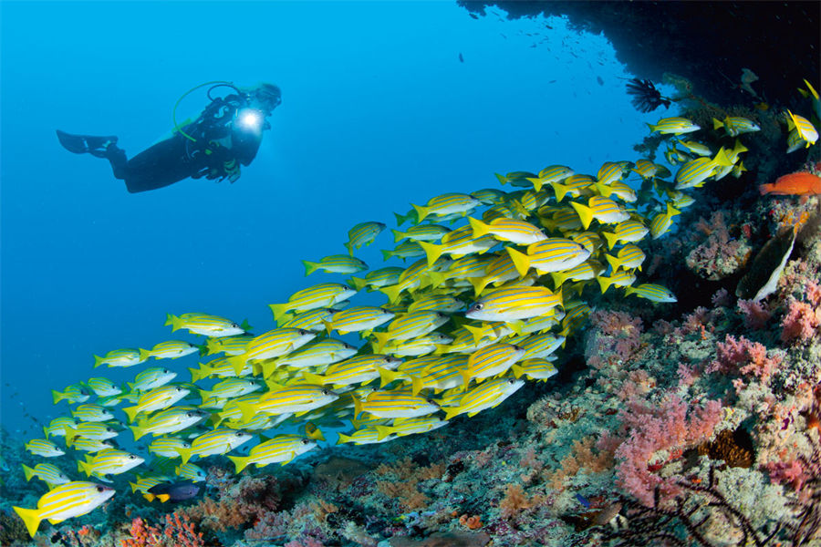 活动简介:潜入海底,彻底远离日常生活中拥堵的交通、二氧化碳污染、嘈杂的噪音和繁重的压力。海底世界是大自然母亲向人类馈赠的又一个奇妙天堂。沉浸在绝对幽然宁静的环境中,探索藏匿在蓝色深渊中的神秘之物。伴随着身旁缤纷绚丽的色彩、奇特怪异的物种和不时出现的令人敬畏的庞然大物,仿佛置于身心双重失重的奇幻世界中。距离Velaa私人岛海岸仅 15 分钟路程之外的地方有一处人迹罕至的潜水地点,灰珊瑚鲨、护士鲨、季节性迁徙的蝠鲼、黑点刺魟和身姿优雅的燕魟等马尔代夫海洋生物经常出没于此。
