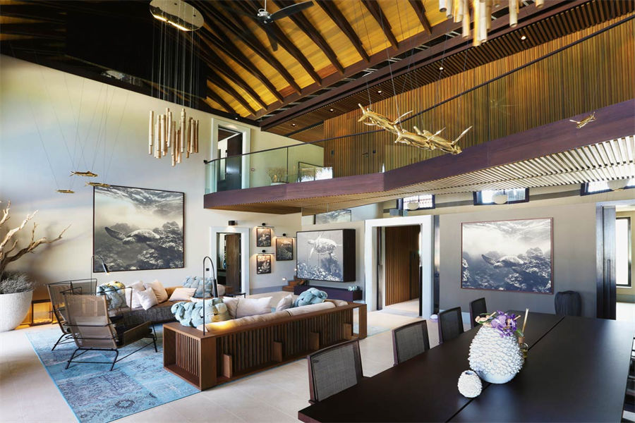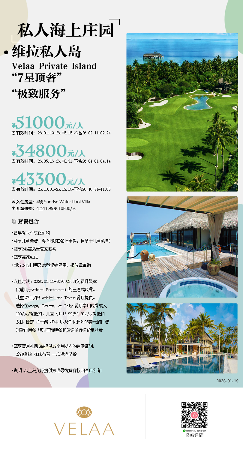 维拉私人Velaa Private Island Maldives,是人间真实存在的世外桃源,成就超越奢华的精致生活。这座岛屿格调别致,集群岛最为精华之处于一体,四周环绕碧绿深邃的印度洋海域,头顶广阔无垠的蔚蓝色天空。Velaa私人岛位于马累以北187公里壮观的诺鲁环礁怀抱之中,可为客人带来绝无仅有的奢华体验和贵族般的尊享礼遇。Velaa私人岛在设计中融入了私密奢享的指导理念,让印度洋成为岛屿的绝对亮点。为实现与自然环境的和谐统一,修建每座私人度假别墅时都就地取材,现代风格的内部装修十分精美,犹如一场华丽的感官盛宴。Velaa私人岛约20公顷,长约530米,宽约450米,是您独享天堂的私密度假岛。为实现与自然环境的和谐统一,修建每座私人度假别墅时都就地取材,现代风格的内部装修十分精美,犹如一场华丽的感官盛宴。Velaa私人岛的名称来源于世世代代栖息在这片海岛上的海龟。设计中微妙地融入海龟壳的颜色与图案,从远处鸟瞰岛屿,水上别墅好似海龟头部,岛屿便是海龟的身体。岛屿的设计出自捷克建筑师Petr Kolar之手,现代化的整体设计中不乏私密元素和马尔代夫的独特风情。岛主Jiri Smejc,这对来自于捷克的富豪夫妻游览了马尔代夫众多度假村,始终无法找到心仪的岛屿,最终自己开一个岛吧,这也是马尔代夫为数不多真正的私人岛屿。房间设施极具考究,几万块的黑金木桌子,桃花溪木房梁,约旦空运大理石,植被全球精选。