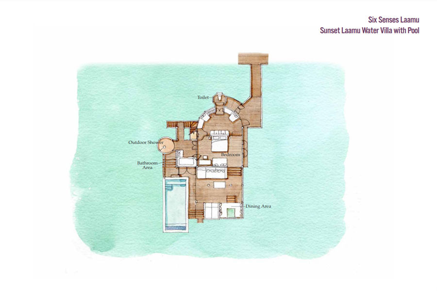 房型介绍:日落拉姆水上泳池别墅全岛仅2栋,面积126㎡,位于古朴木板码头 A 的尽头,占据优越的位置,可一览无余地观赏海上日落和变幻的彩霞。