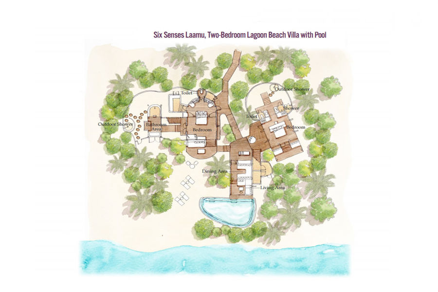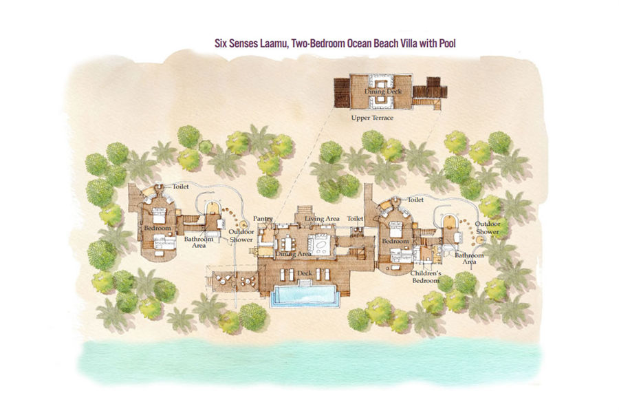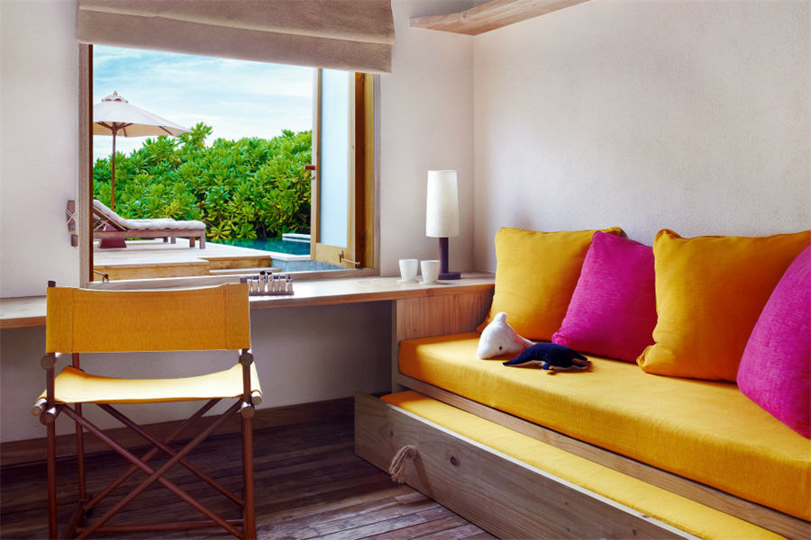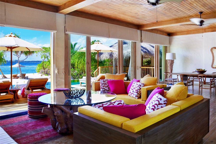 房型介绍:双卧海洋沙滩泳池别墅全岛仅1栋,面积730㎡,它包括有两套沙滩别墅,各自带有大卧室和室外浴室,中间以共用餐厅和起居室连通。这套家庭别墅拥有10米长的私人泳池,可通过专属通道前往几米之外的海滩。