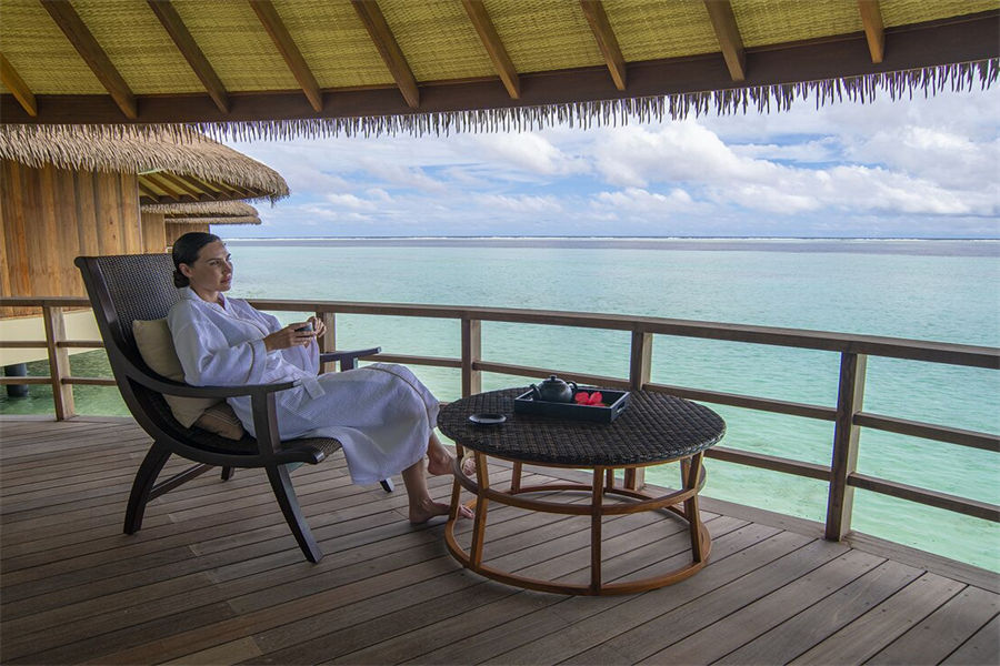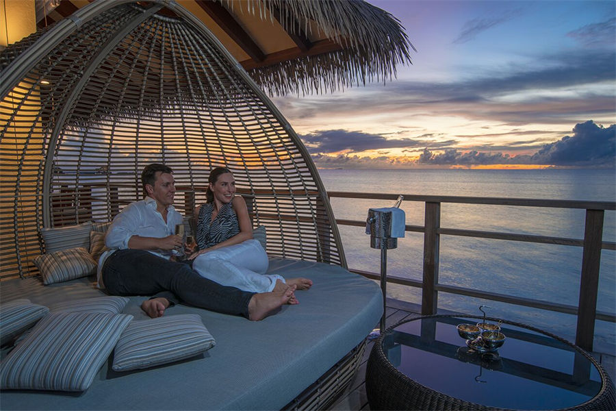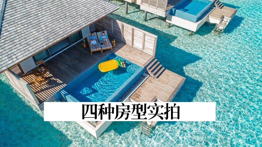 房型介绍:全岛54栋的水上泳池别墅面积为152㎡,分为日出日落两种朝向,可以自由选择,日出有29间,日落有25间。别墅悬浮在清澈的绿松石泻湖上,距离海面足够近,你可以在水中浸泡脚趾,同时欣赏全景海景。在舒缓的海浪声中安然入睡。当你在私人游泳池游泳时,与大海融为一体,躺在阳台上就能享受阳光的温暖。