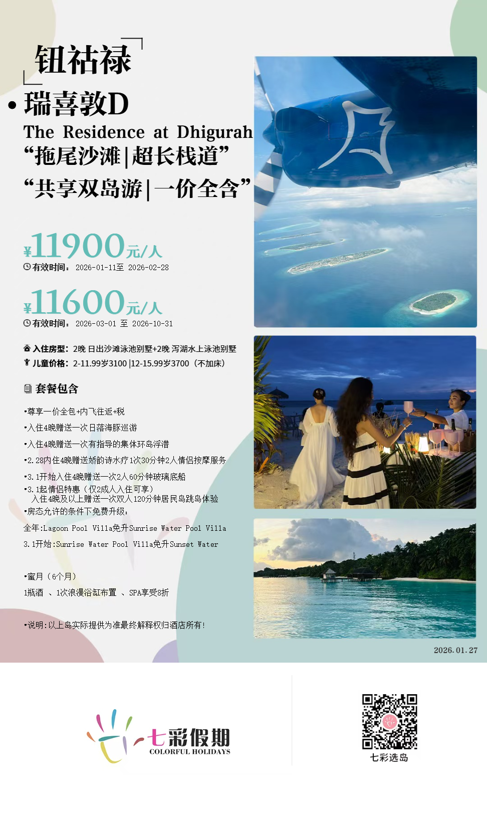 活动简介:瑞喜敦迪鼓拉岛与同集团的瑞喜敦F岛以栈桥相连,这把两个岛组成了马尔代夫最大的岛屿度假圣地之一,穿过这座栈桥,就能轻松实现双岛游。