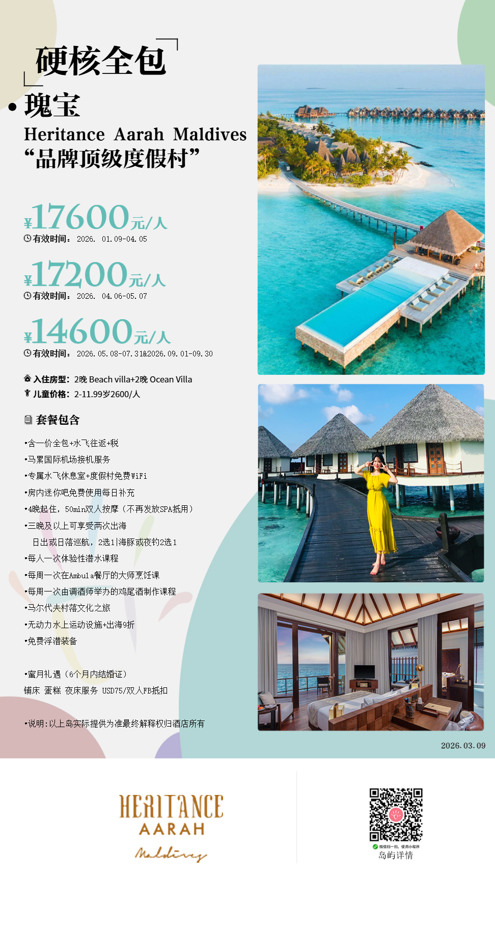 马尔代夫瑰宝Heritance Aarah Maldives Luxury Resort,是阿达拉旗下度假村,姐妹岛个个鼎鼎大名,还有瓦杜、绚丽、密度帕茹、白金岛。瑰宝岛位于美丽原始的Raa环礁,距离马累国际机场约45分钟⽔飞路程。这是一个人人都夸非常出片的岛屿,主泳池位于沙滩上,酒吧和餐厅位于紧挨;而蜜月海上星空泳池附带一个海上酒吧,不但出片,看夕阳和星空的绝佳场所。水上复式双层泳池别墅留给人的印象很深,蜜月客人千万不要错过。而夸张的7个餐厅,5个酒吧把顶奢诠释到了极致,并且全包非常硬核,所有餐饮单元可以使用,2次出海,SPA券,很值得。