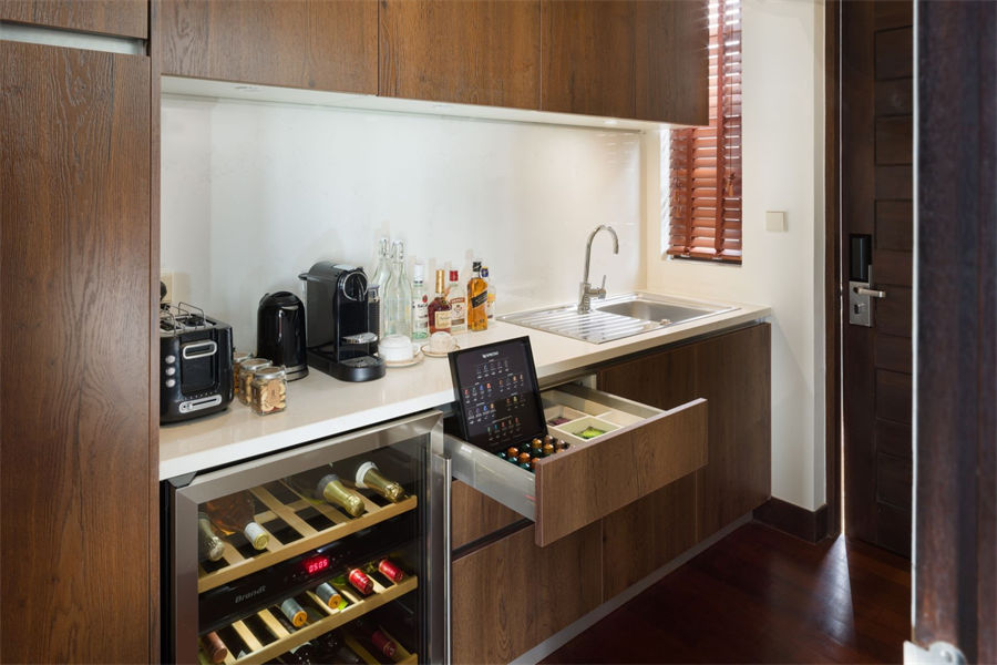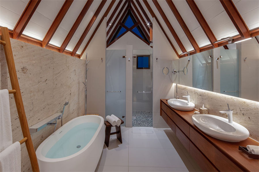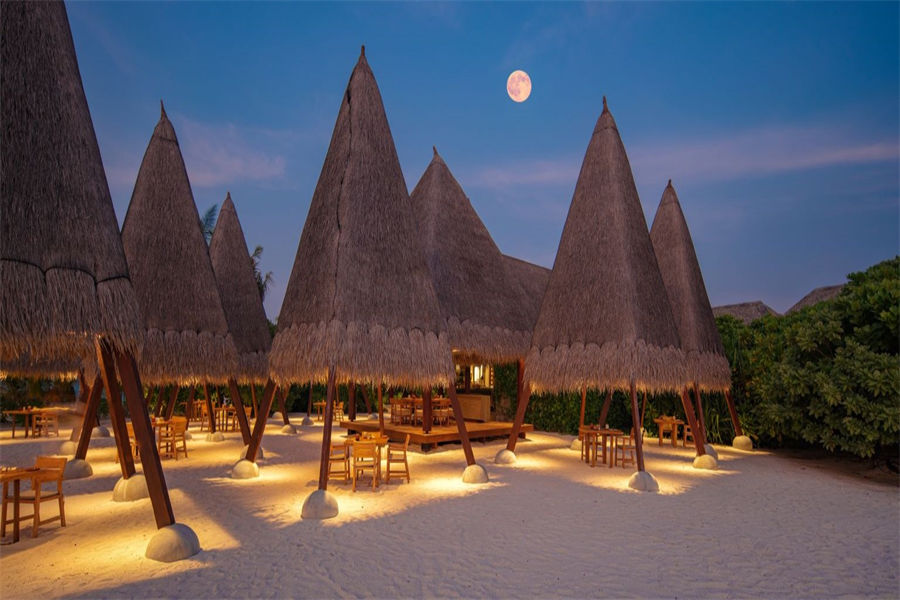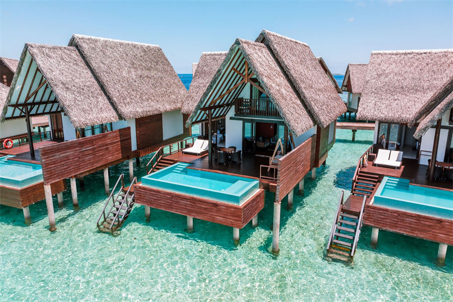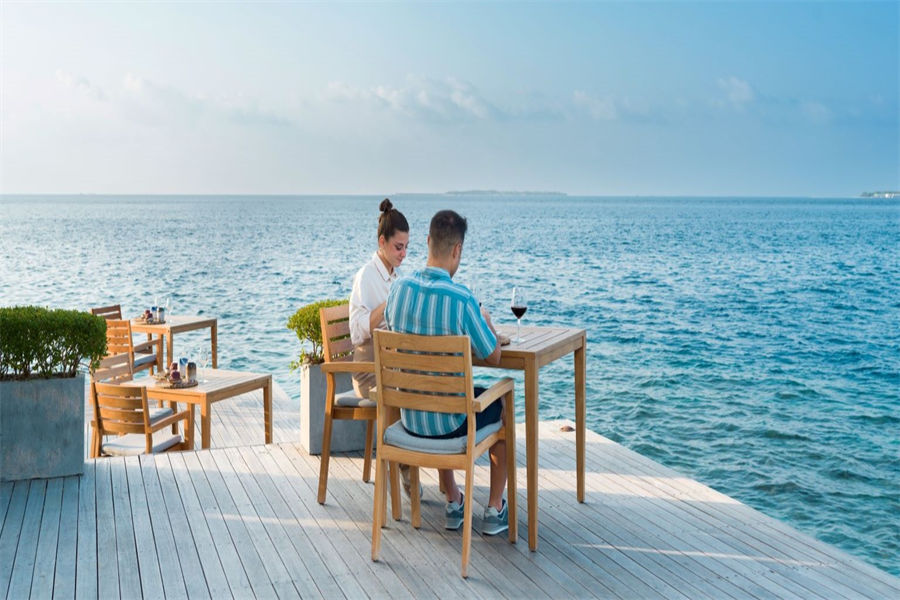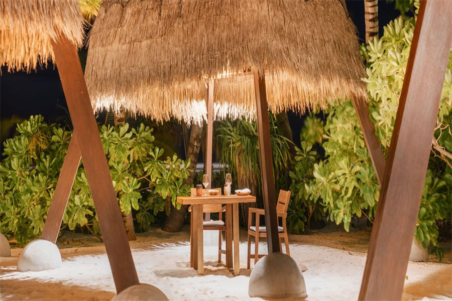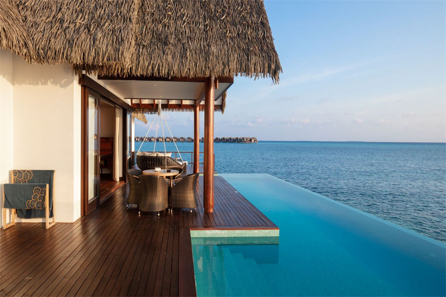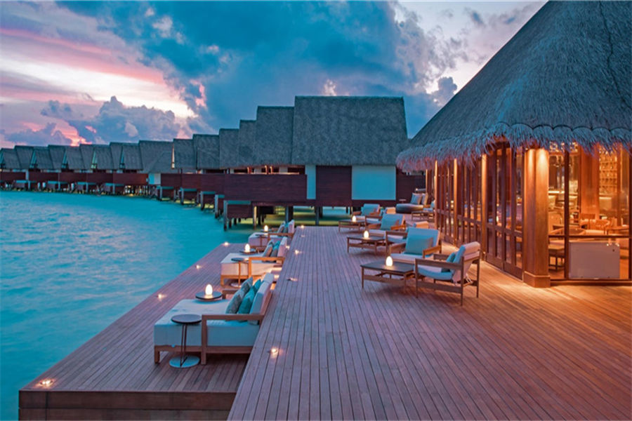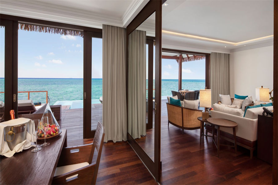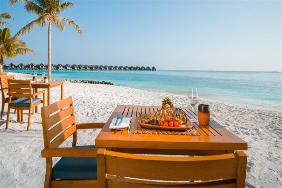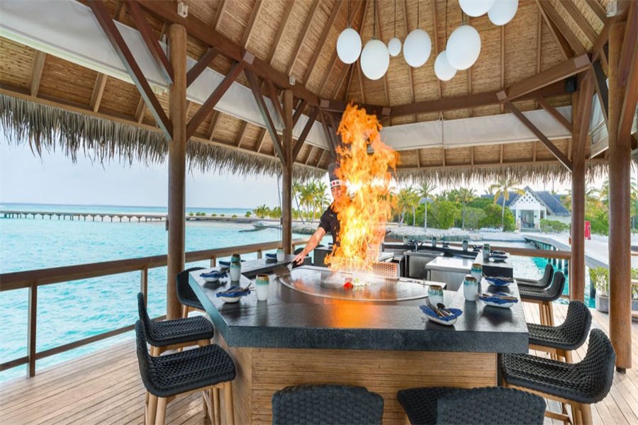 ②56间海洋别墅和25间复式海洋套房,提供独特的水上餐厅和私人管家服务,不同房型有不同的专用餐饮场
