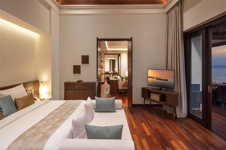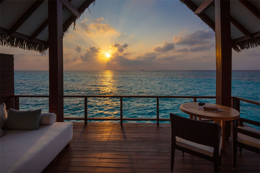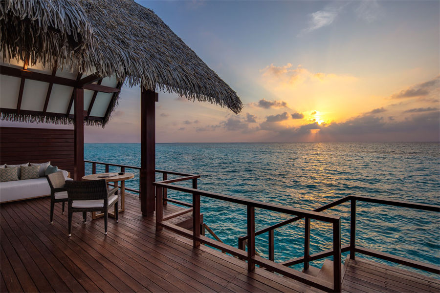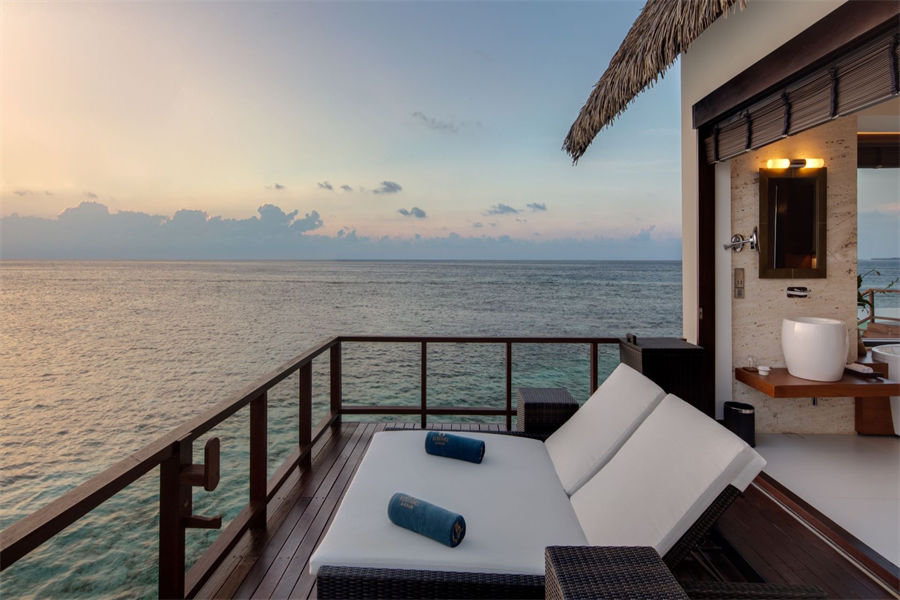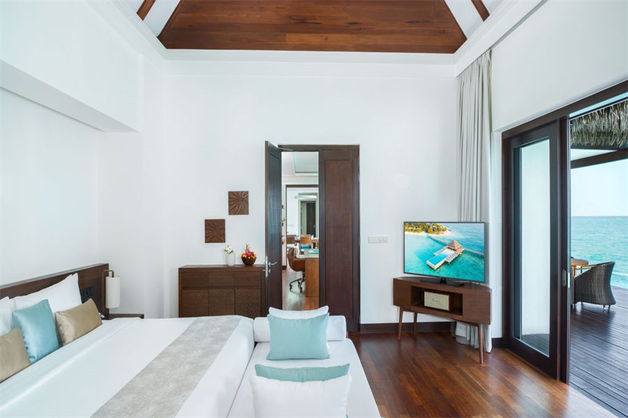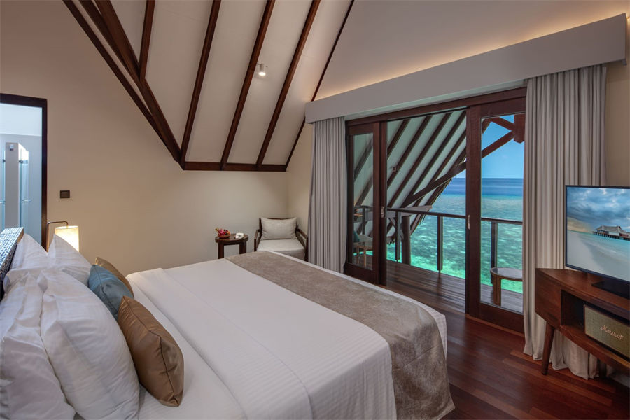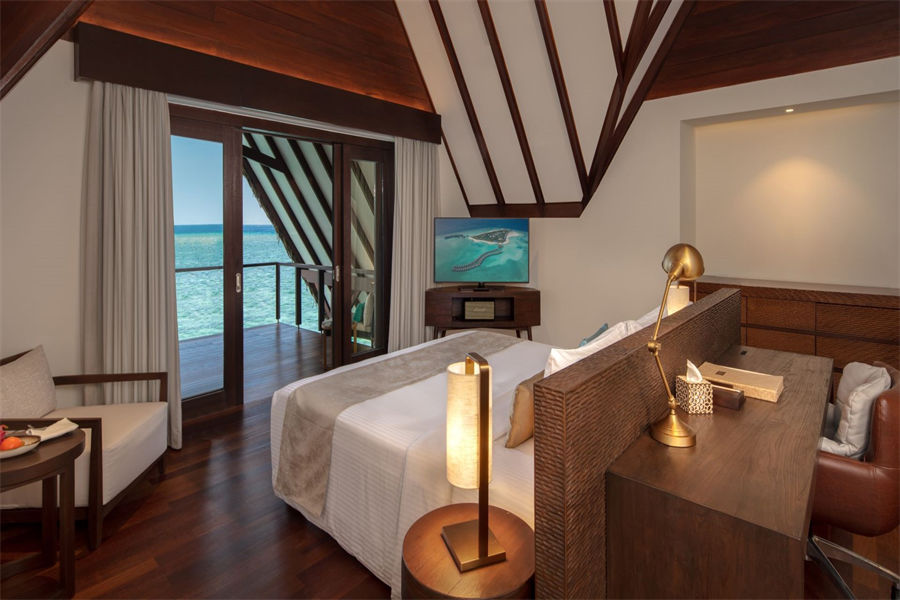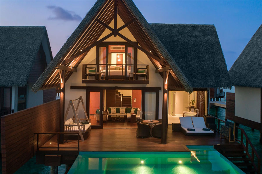 房型介绍:全岛共56栋的海洋别墅面积91㎡,坐落在波光粼粼的泻湖之上,俯瞰着无限的地平线。每一栋配有玻璃地板,在舒适的别墅中您也可以享受水下奇观。私人户外甲板为您提供了一个浪漫的环境,可以蜷缩在浪漫的日落下,也可以在下面的水中畅游。