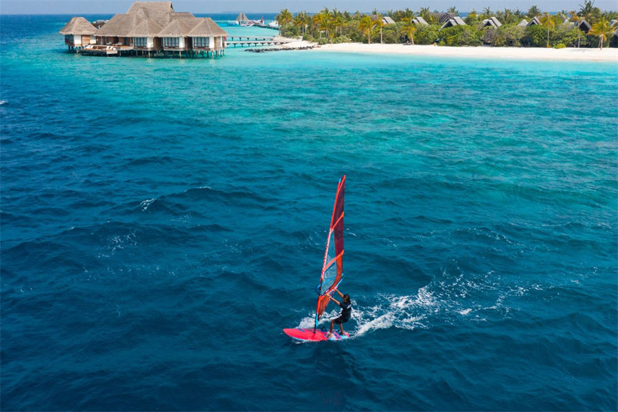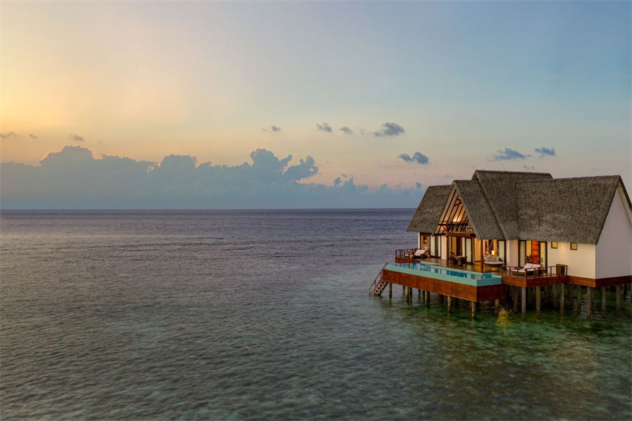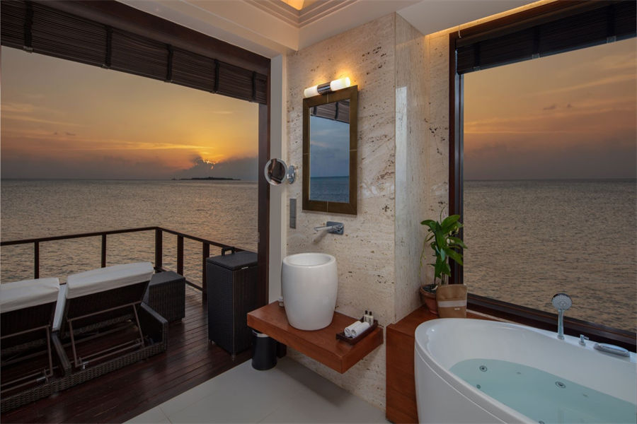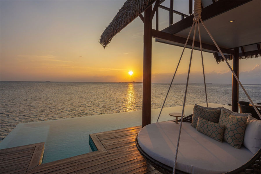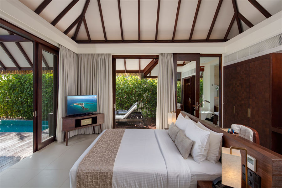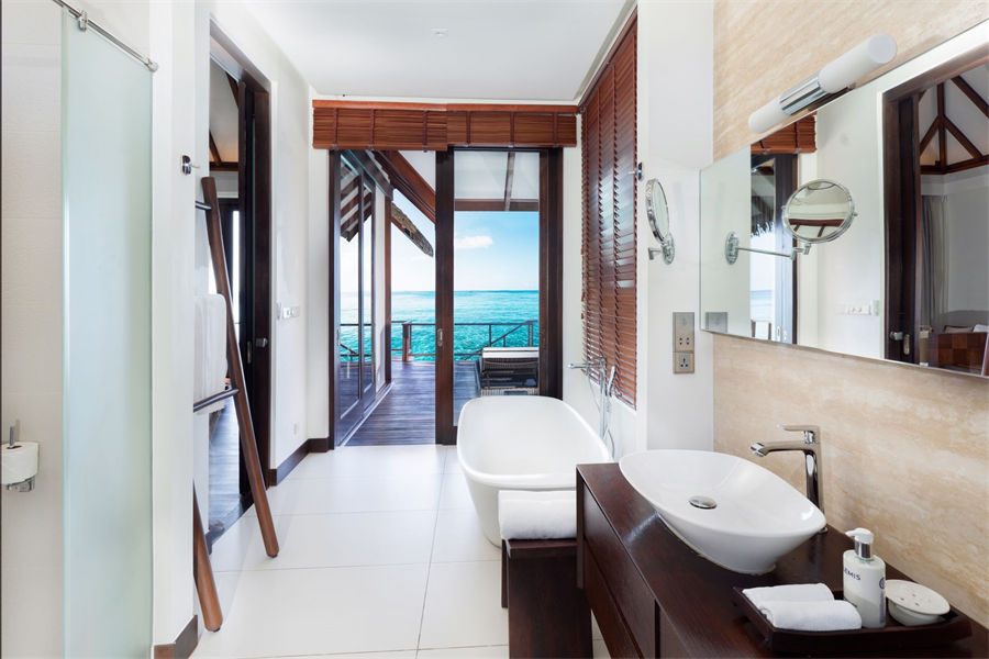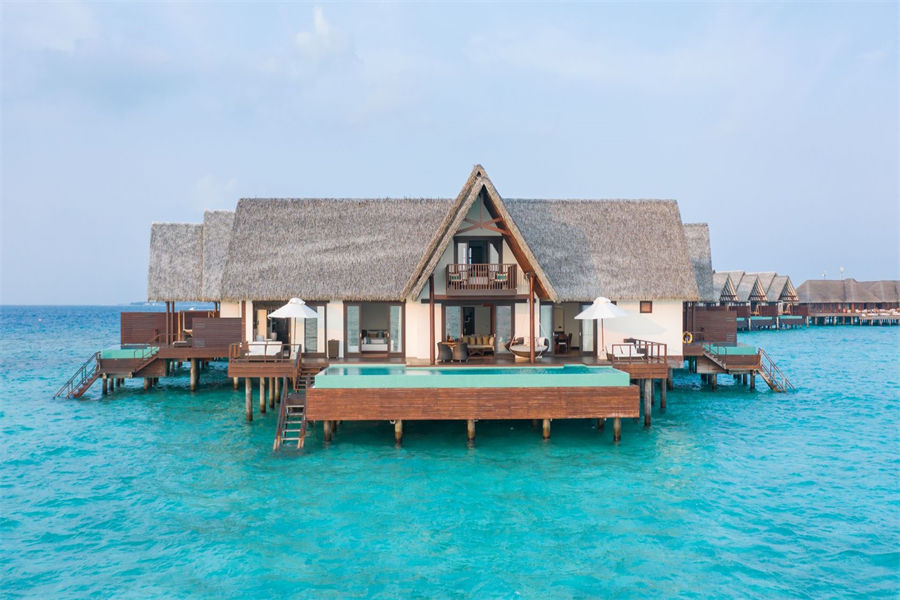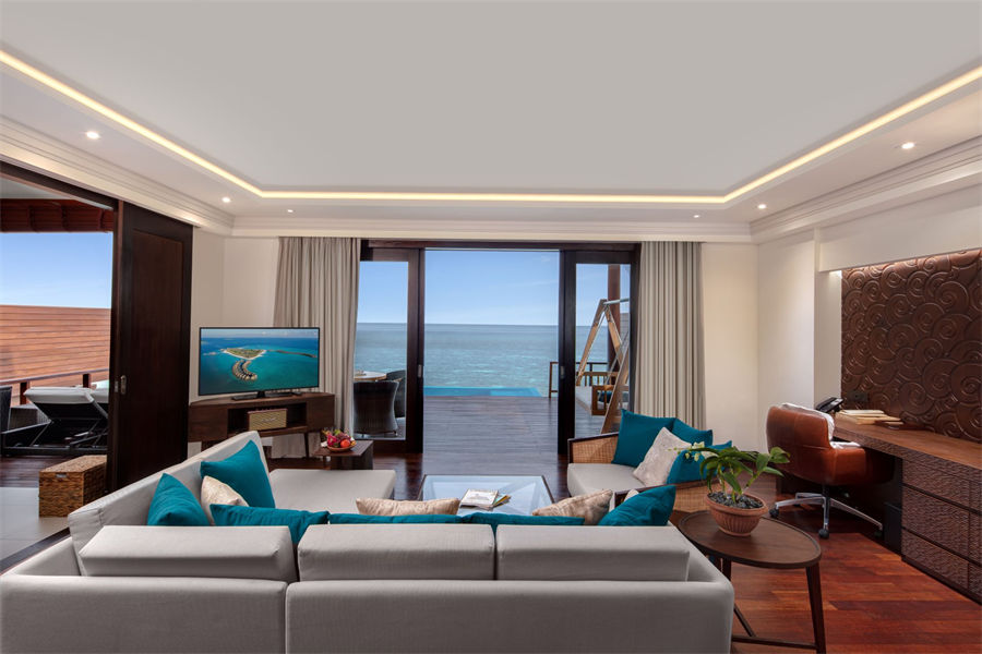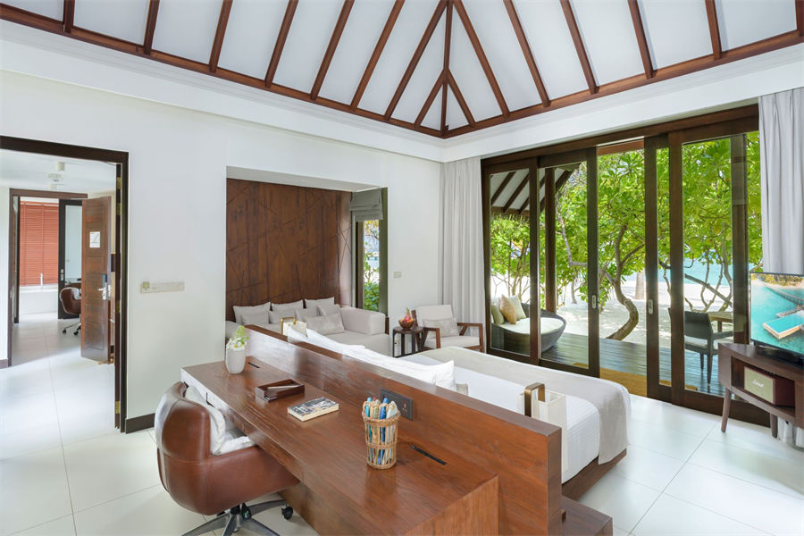房型介绍:全岛共56栋的海洋别墅面积91㎡,坐落在波光粼粼的泻湖之上,俯瞰着无限的地平线。每一栋配有玻璃地板,在舒适的别墅中您也可以享受水下奇观。私人户外甲板为您提供了一个浪漫的环境,可以蜷缩在浪漫的日落下,也可以在下面的水中畅游。