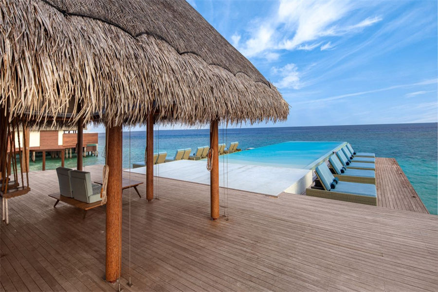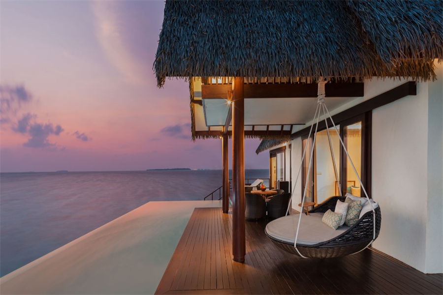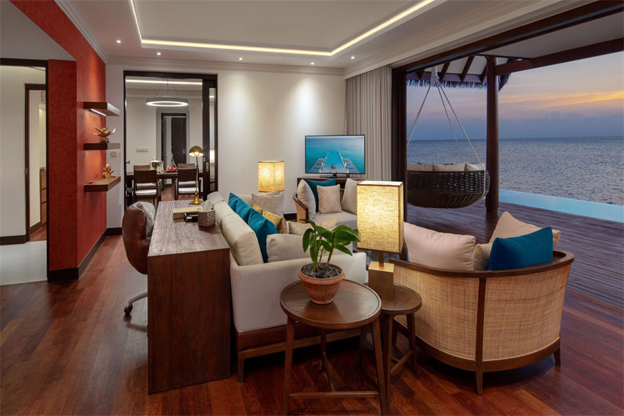 房型介绍:全岛仅1栋的海洋住宅面积298㎡,是一个隐蔽的庇护所,完美体现了精致的岛屿奢华,住宅配有管家服务,使其成为您在Raa环礁上的家。配有起居区、餐具室、两间卧室和一间独立的保姆室,通向宽敞的甲板,可以俯瞰波光粼粼的海水。还有私人无边泳池和超大的秋千,让您在这里度过一段宁静放松的时光。