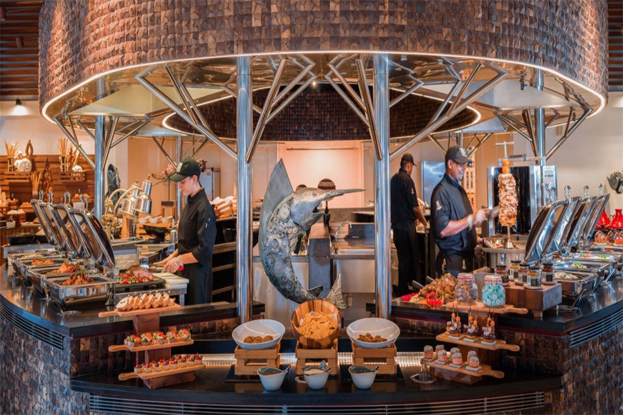 餐厅介绍:客人可以一边享用迷你自助餐中的丰盛餐点,一边观看厨师烹制的经典佳肴。或从每日最爱菜单中点菜。全天候开放给所有客人。