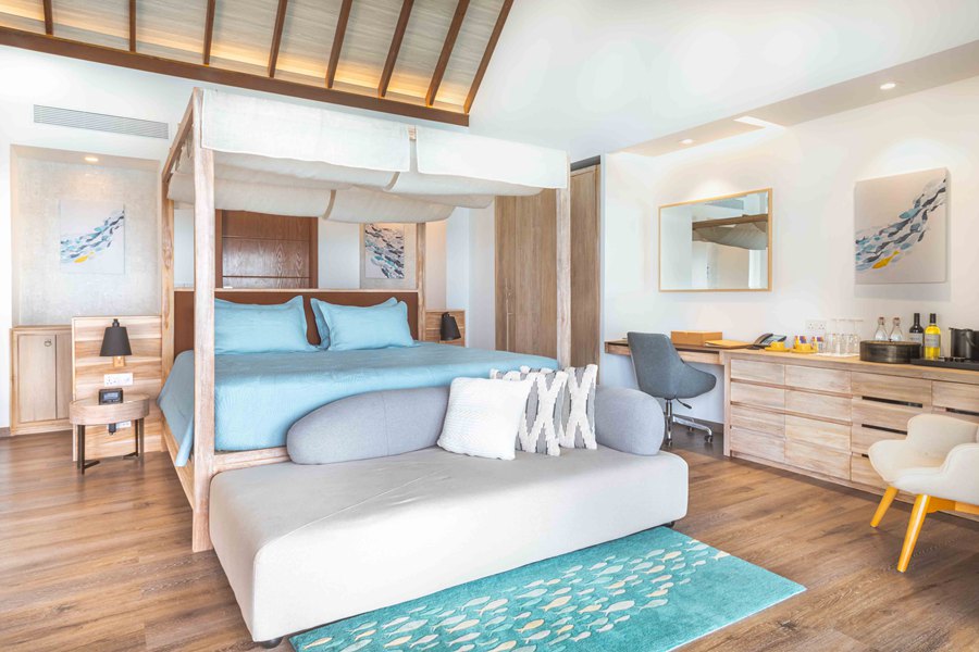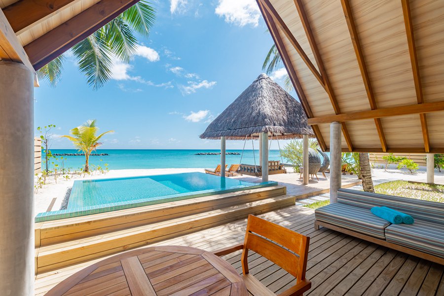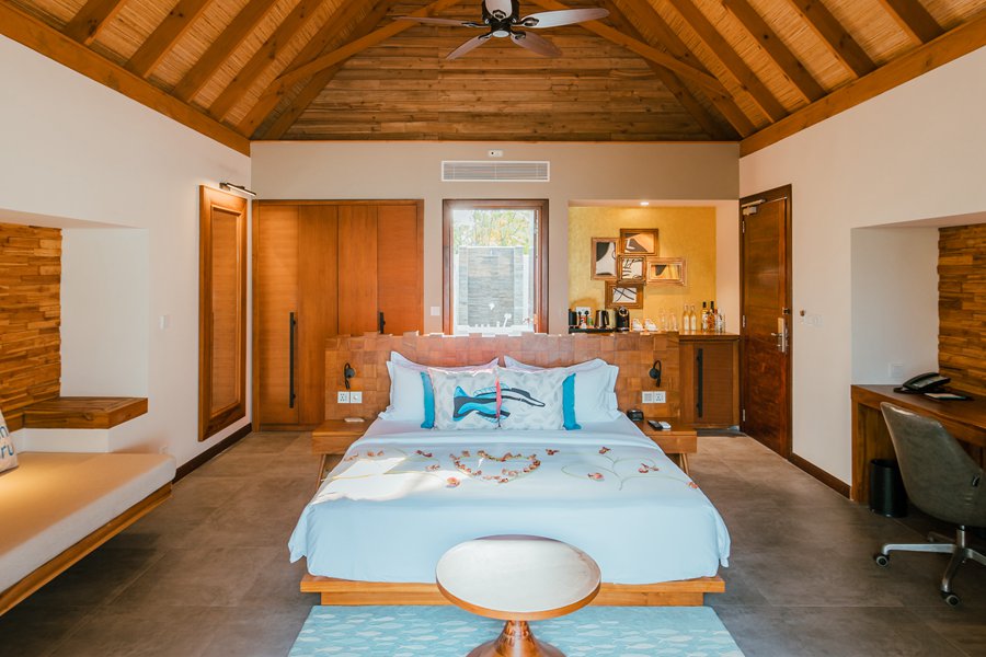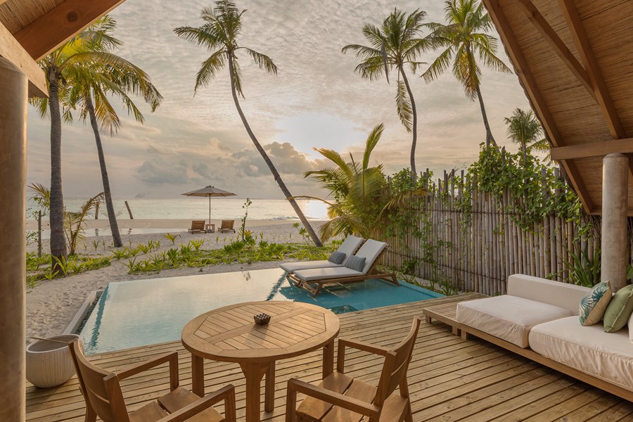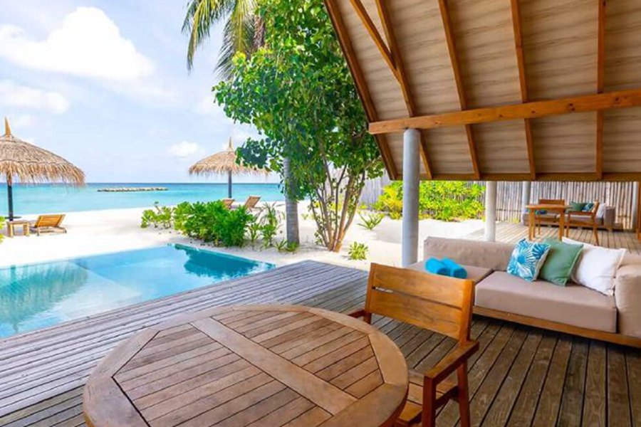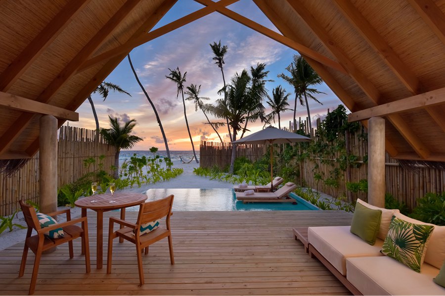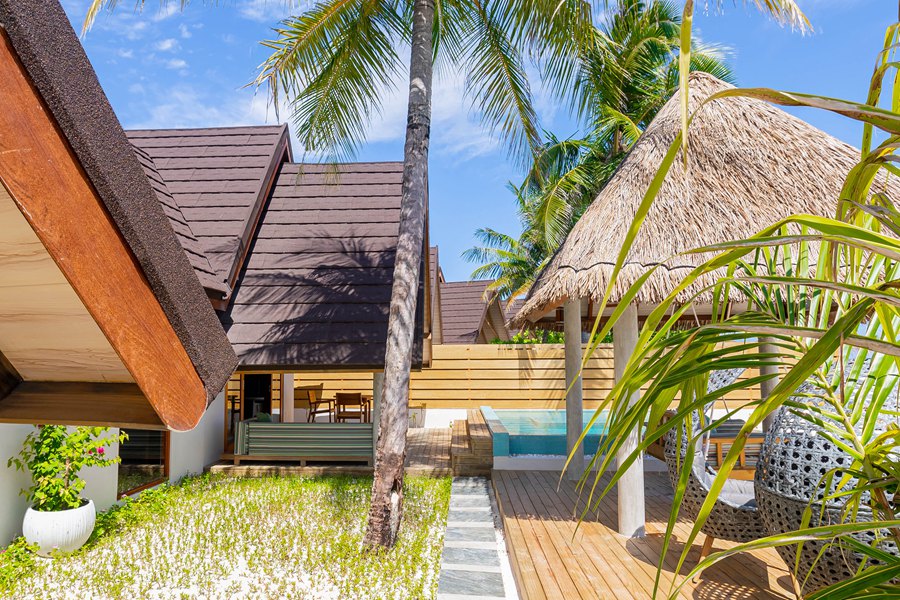 房型介绍:面积为240平米,全岛仅有4栋,相当于是2栋别墅,沙滩别墅和泳池沙滩别墅组成,连接部分是公共客厅。隐藏在郁郁葱葱的热带植物,抬头就是壮丽的海景。