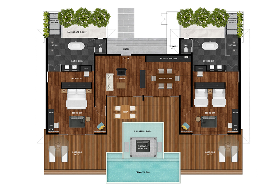 房型介绍:双卧别墅拥有无敌的海景,并且处于较为独立的沙滩区域,非常私密。拥有两间卧室,并且拥有超大日光浴甲板和私人游泳池,是一家子完美度假的室外桃园。