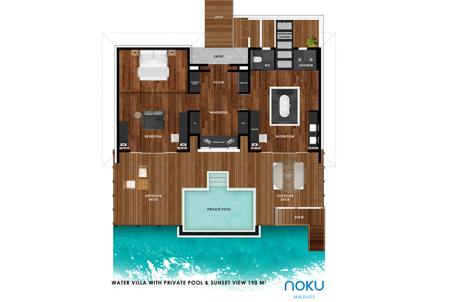 房型介绍:位于岛屿西南部,靠近珊瑚区,并且能欣赏到岛屿最美的夕阳。拥有宽敞的卧室和起居室,透过大窗户就能欣赏到印度洋美景。可以再私人游泳池中畅游,并享受室内外淋浴和独立式浴缸。