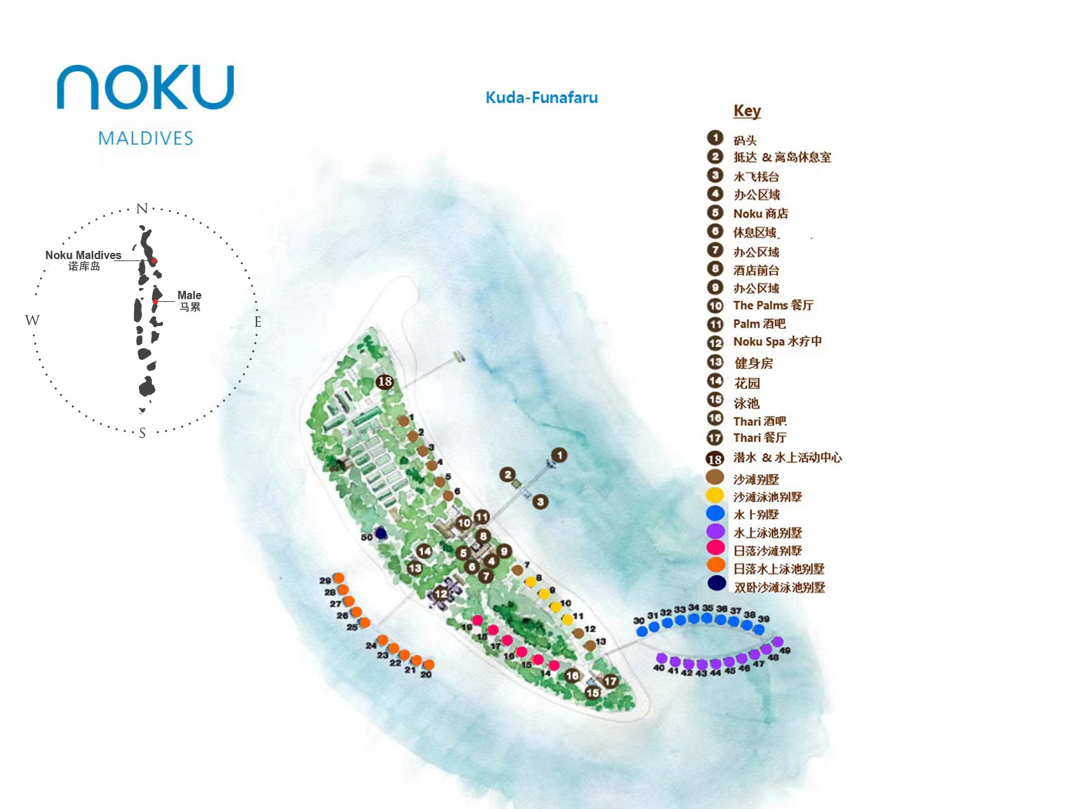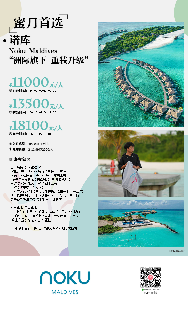 马尔代夫诺库Noku Maldives,乘坐水上飞机45分钟抵达。曾用名为吉塔莉,Z岛,洛克希,所以不要误以为是一个新岛,其泄湖、浮潜和沙滩达到了相对的平衡,岛屿面积很小,仅仅只有50间别墅,追求宁静私密的客人一定会喜欢。特别是再2017年大型装修以后,更符合国人的需求,而价格相对性价比较高。泳池水屋一侧靠近海沟,适合浮潜达人。在2025再次进行了装修和翻新,整体上风格更加简约高级。