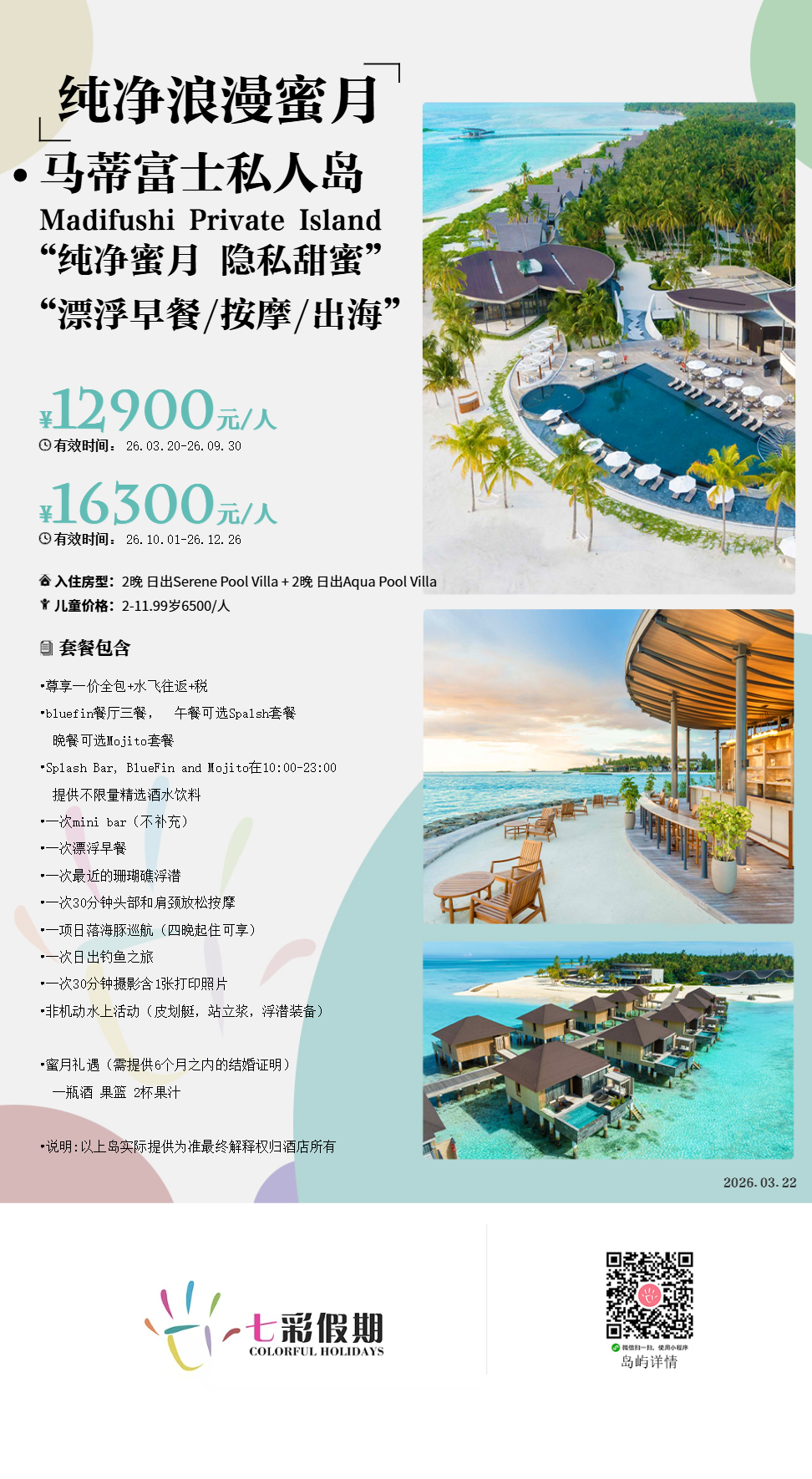 房型介绍:马蒂富士岛唯一的专属别墅享有印度洋的全景和马尔代夫日落的迷人景色。水上套房位于岛顶端 100 米处。醒来后,您可以在自己的无边泳池中享用美味的漂浮早餐,或者在私人吊床上享用完美的日落鸡尾酒,为您的夜晚放松身心。入住的客人将由他们自己的私人管家陪同,以满足您的要求。