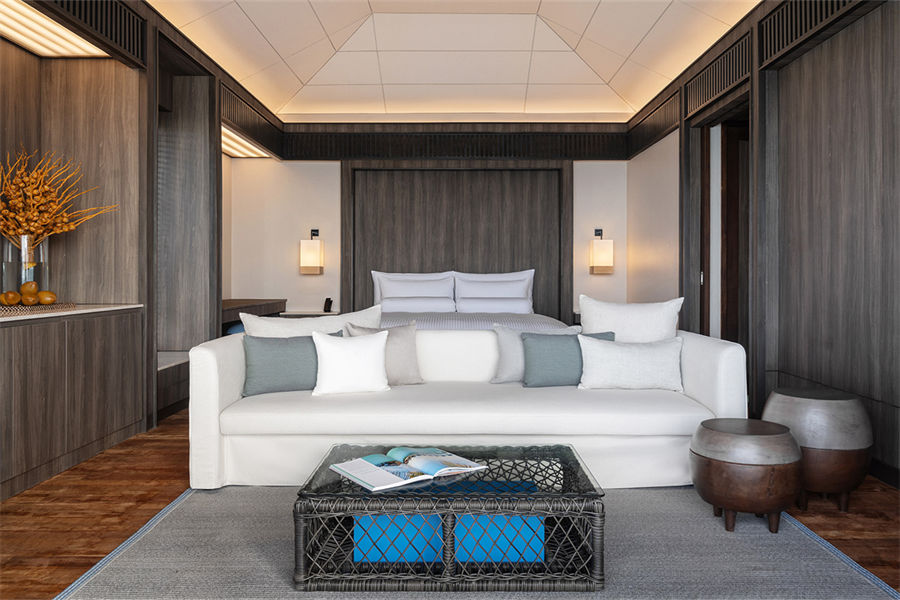房型介绍:水上泳池别墅共有46间,朝向不同。其中26间是日出景观,另外20间是日落景观。房间面积123平米,室外的甲板区域非常宽敞,除了常规的阳光躺椅、休闲区域和私人泳池外,浴缸直接置于室外,在这里泡浴会有很独特的体验。