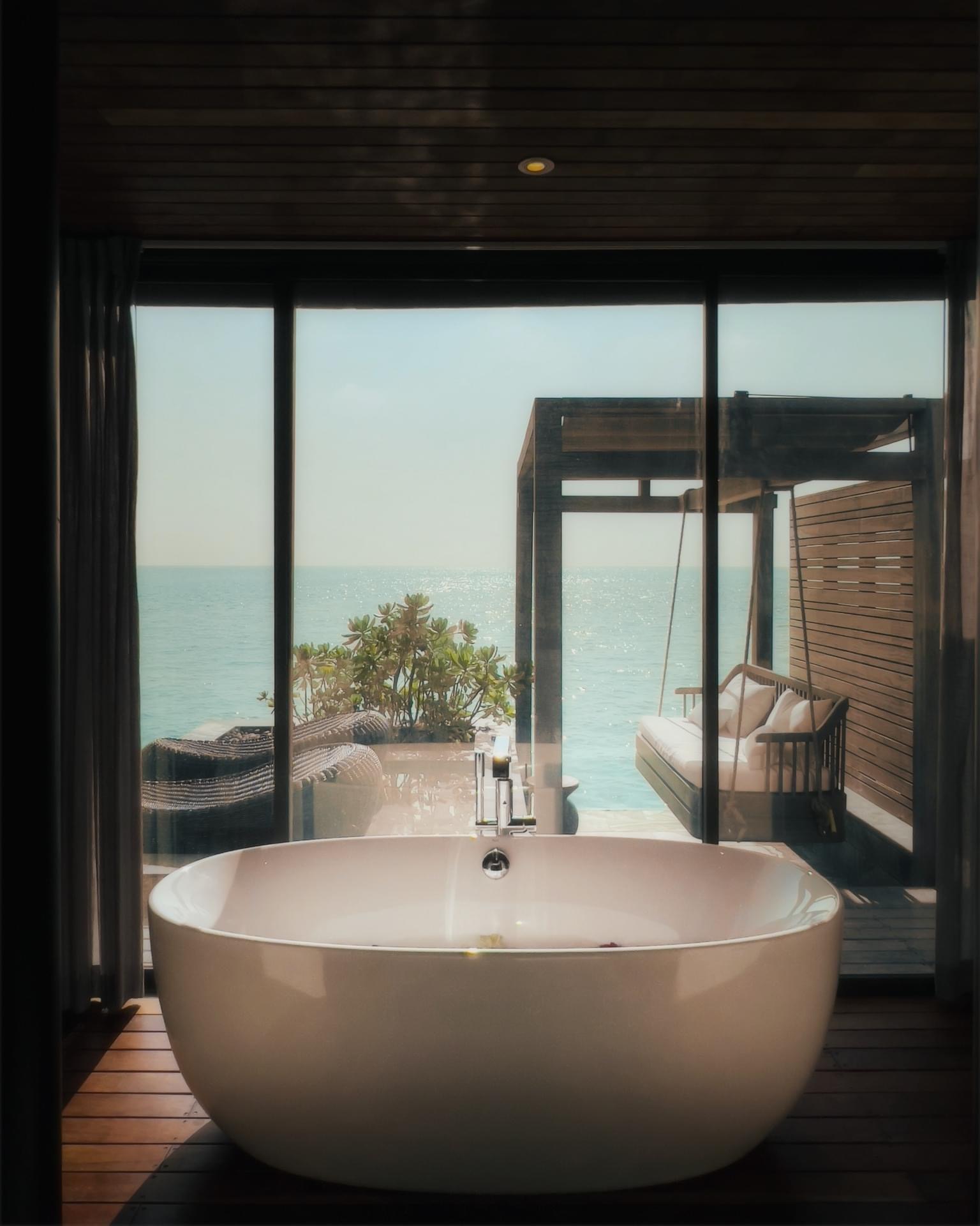 豪华浴室设有海景漩涡浴缸和沙发床。在上层的私人户外吊床中自由享受完美的阳光照射。入住这间套房的客人将获得自己的私人管家,以满足他们的每一个需求以及随叫随到的健身教练和水疗护理。
