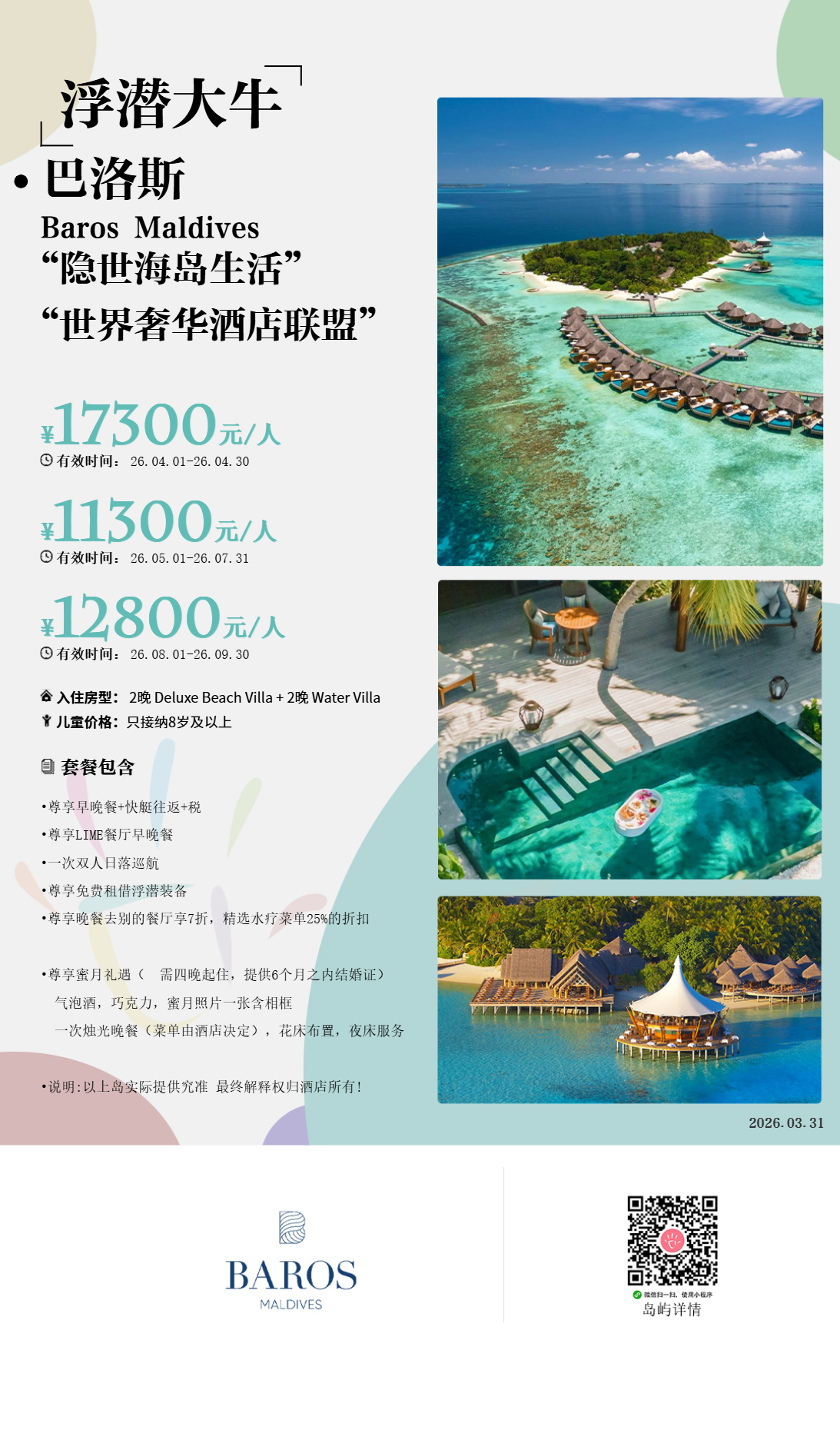 房型介绍:巴罗斯岛是马尔代夫的顶级度假胜地之一,隐藏在天然丛林中,树叶在头顶沙沙作响,海浪声和海浪飞溅。巴罗斯岛拥有马尔代夫最好的海滩别墅,您可以在海滨甲板的凉爽树荫下欣赏海景。在沙滩上,私人日光躺椅和茅草遮阳伞让您舒适地度过一天,泻湖的蓝色海水距离酒店仅几步之遥。在室内,您可以享受温馨舒适的家具、丰富的木材色调和阳光下的各种便利设施。