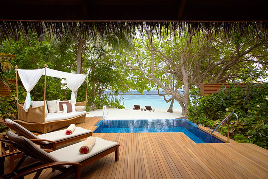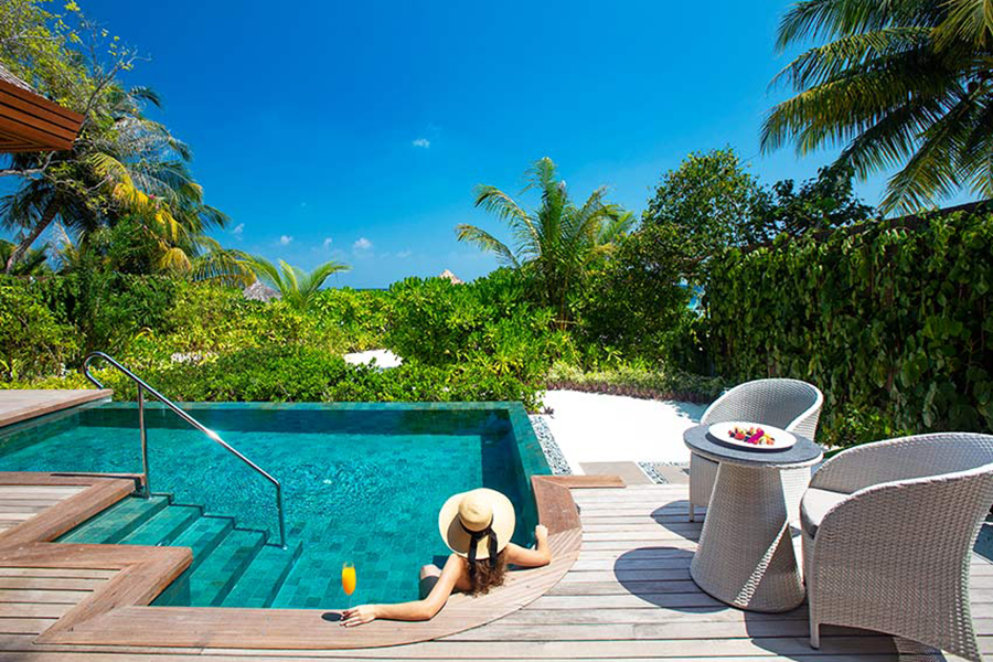 房型介绍:私人海滩花园,热带树木下的阴凉游泳池 - 巴罗斯泳池别墅提供宁静的休息场所,距离泻湖仅几步之遥。在您的甲板上,您有一张带顶篷的沙发床和日光躺椅,在那里可以沐浴在海景中度过几天。白色的沙滩、碧绿的海水和珊瑚礁的奇观距离酒店仅有数米之遥。在室内,空间充满了轻松的魅力——舒适的床、丰富的木制家具和定制的巴罗斯洗浴用品。