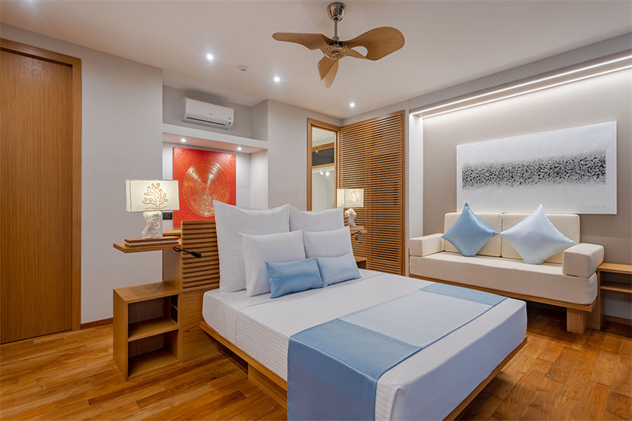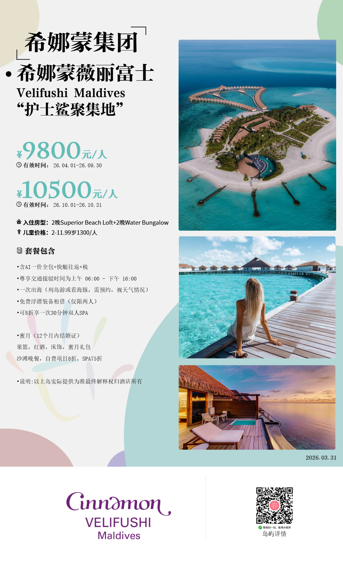 马尔代夫薇丽富士Cinnamon Velifushi Maldives,位于Vaavu环礁,是斯里兰卡的希拉蒙酒店集团Cinnamon Hotels&Resorts(也叫肉桂酒店集团)在马尔代夫开设的第四家度假胜地。薇莉富士岛于2019年10月1日正式开业,酒店位于Vaavu环礁,从马尔代夫马累国际机场乘25分钟的水上飞机或乘坐75分钟的快艇即可到达。岛上共有90间别墅,客人可以选择高级海滩阁楼房,海滩平房,水上别墅,带按摩浴缸的日落水上别墅或带游泳池的水上套房作为自己的度假休憩地。Vaavu环礁是马尔代夫最好的潜水地点区域,浮潜和水肺潜水都非常适合,尤其是独一无二的“与鲨鱼潜水”项目。
